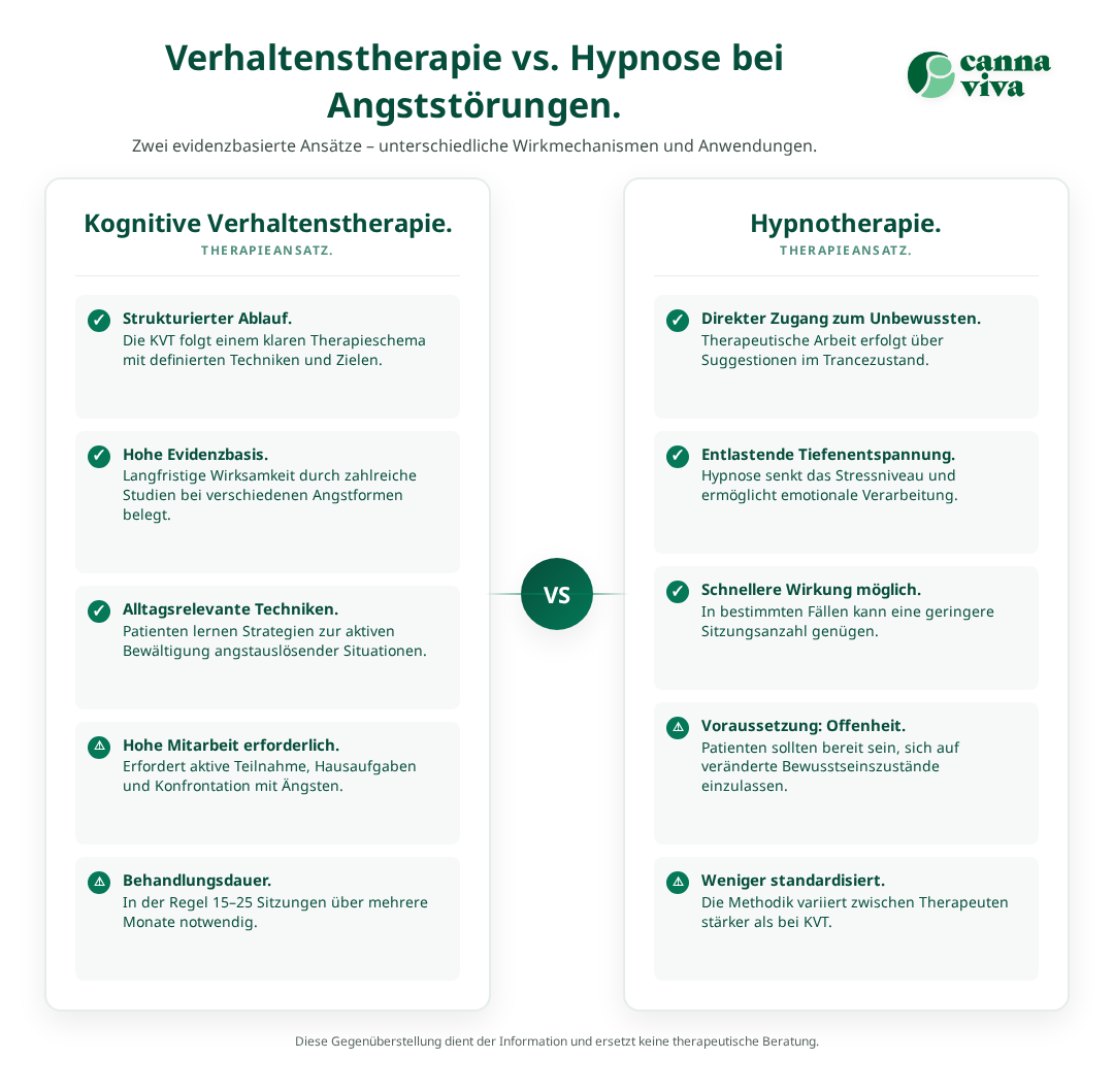 Verhaltenstherapie und Hypnose sind zwei evidenzbasierte Therapieansätze, die sich in der Behandlung von Angststörungen bewährt haben. Während die kognitive Verhaltenstherapie auf bewusste Lernprozesse und die systematische Veränderung dysfunktionaler Denkmuster setzt, nutzt die Hypnose das Potenzial des Unterbewusstseins zur Auflösung tief verankerter Ängste. Beide Ansätze bieten unterschiedliche Zugänge zur Symptomlinderung und können je nach individuellen Bedürfnissen und Präferenzen der Patienten eingesetzt werden.