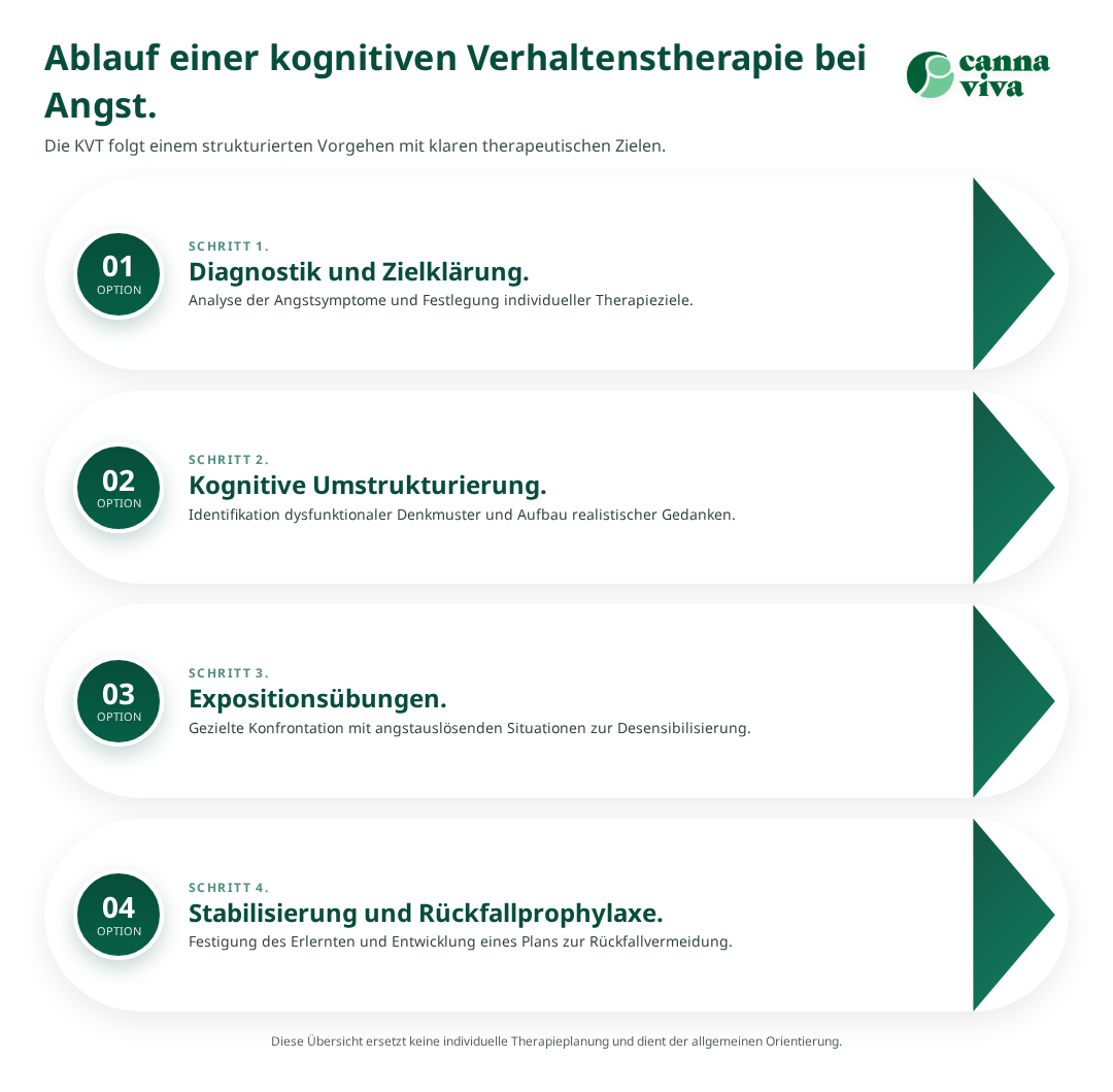Die kognitive Verhaltenstherapie (KVT) gilt als evidenzbasierter Goldstandard in der Behandlung von Angststörungen und wird von allen grossen Fachgesellschaften als Therapie der ersten Wahl empfohlen.[2] Sie basiert auf dem Grundprinzip, dass Gedanken, Gefühle und Verhaltensweisen eng miteinander verknüpft sind und sich gegenseitig beeinflussen. Ziel der Therapie ist es, dysfunktionale Denkmuster zu identifizieren, zu hinterfragen und durch realistische, funktionale Alternativen zu ersetzen.