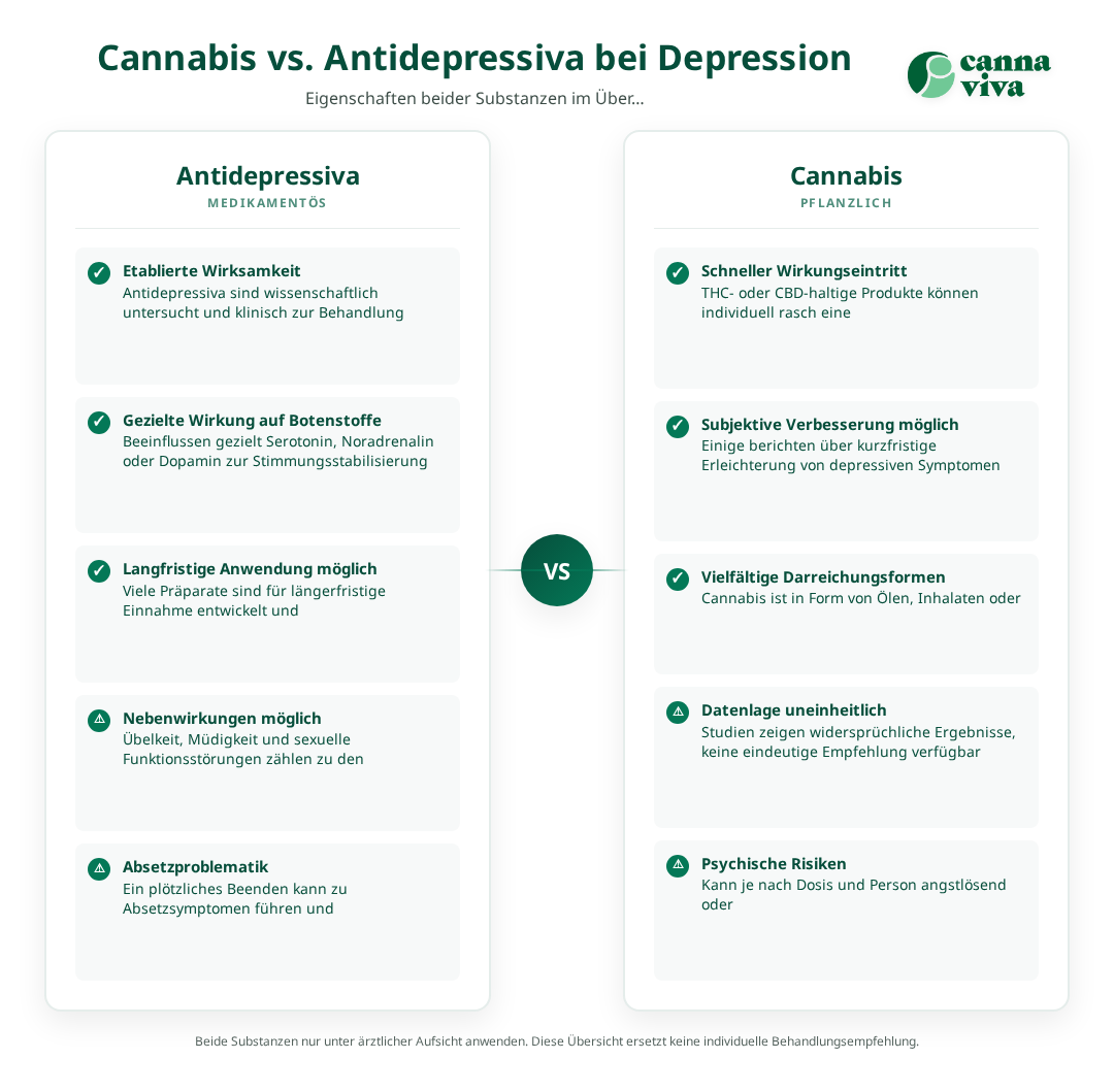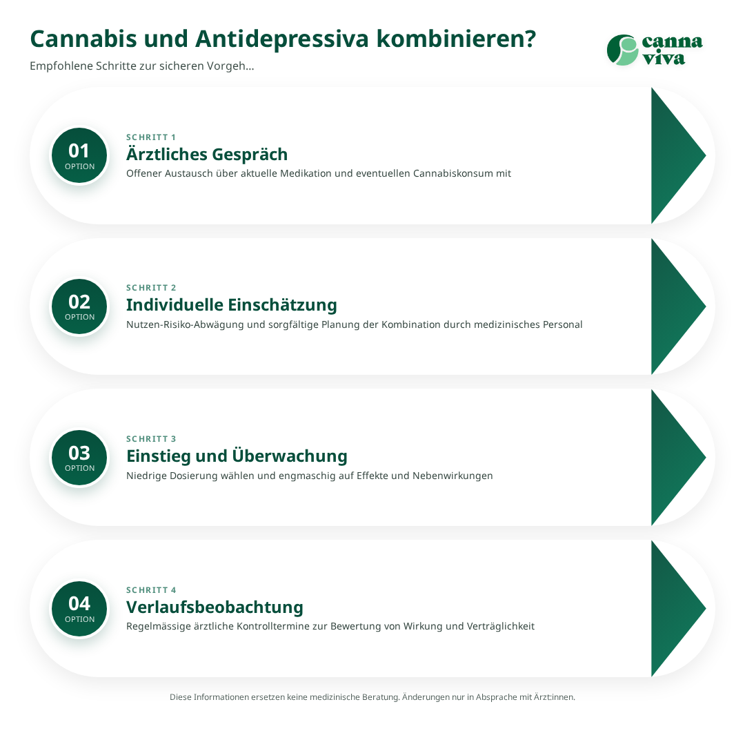 Wenn Sie Antidepressiva einnehmen oder planen, damit zu beginnen, besprechen Sie jede Form von Cannabis (medizinisch oder Freizeitgebrauch) offen mit der verschreibenden Ärztin oder dem Arzt. Änderungen an Dosis oder Substanzen sollten niemals eigenmächtig erfolgen. Bei Nebenwirkungen oder Verschlechterung der Stimmung sofort ärztlich abklären.