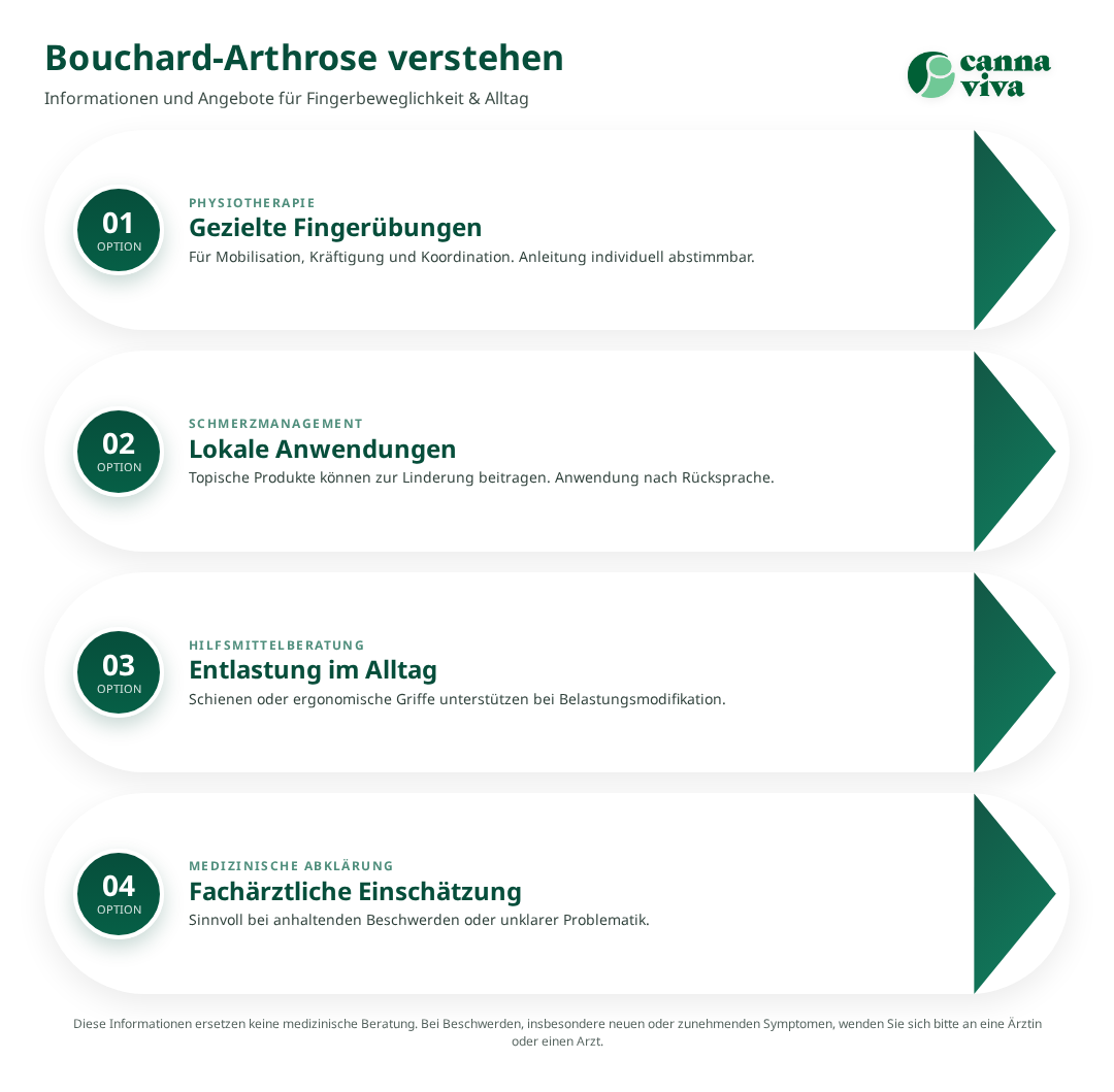 Bouchard-Arthrose bezeichnet degenerative Veränderungen der mittleren Fingergelenke (Mittelgelenke, PIP-Gelenke) mit typischen Knotenbildungen, Schwellung und eingeschränkter Beweglichkeit. Der Artikel richtet sich an Betroffene und Angehörige und beschreibt Ursachen, konservative Behandlungsoptionen, konkrete Übungsprogramme sowie Sicherheitsaspekte. Die Evidenz für spezifische Massnahmen ist heterogen; viele Empfehlungen basieren auf klinischer Praxis und Übertragungen von Studien zu Arthrose im Allgemeinen. Bei stärkerer Funktionseinschränkung oder unklarer Diagnostik ist eine fachärztliche Abklärung sinnvoll.