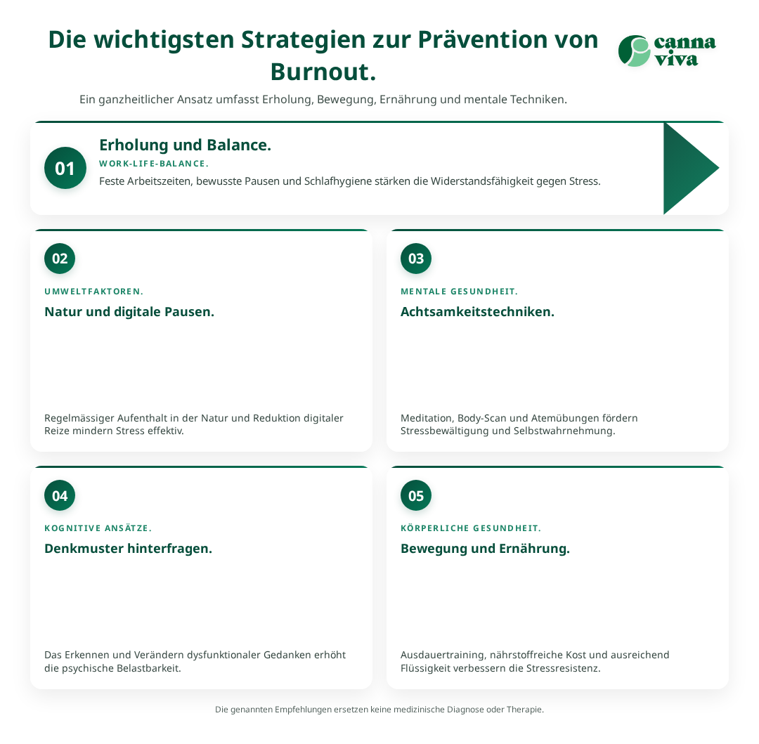Bei Cannaviva verstehen wir, dass Burnout-Prävention ein ganzheitlicher Ansatz erfordert, der sowohl konventionelle als auch innovative Behandlungsmethoden berücksichtigt. Unser Team aus erfahrenen Ärzten und Therapeuten kann Sie dabei unterstützen, individuelle Präventionsstrategien zu entwickeln und umzusetzen.