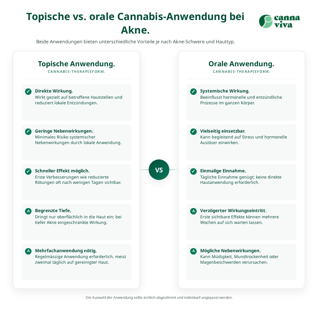 Cannabis kann bei Akne sowohl topisch (auf die Haut aufgetragen) als auch oral eingenommen werden. Beide Anwendungsformen haben spezifische Vorteile und können je nach Schweregrad der Akne und individuellen Bedürfnissen eingesetzt werden.