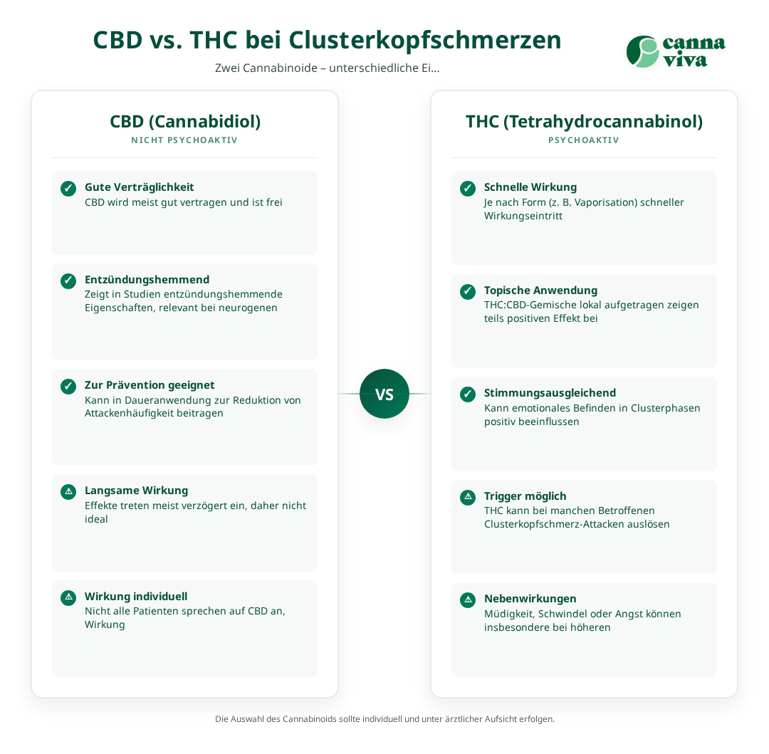 Gleichzeitig berichten andere Patienten von keiner merklichen Besserung oder sogar einer Verschlechterung ihrer Symptome. Besonders problematisch kann das Rauchen von Cannabis sein, da es bei manchen Betroffenen Clusterkopfschmerzen auslösen kann.[5] Diese stark individuellen Unterschiede unterstreichen die Notwendigkeit einer personalisierten Herangehensweise.