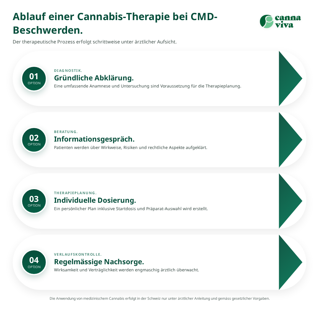 Medizinisches Cannabis eröffnet CMD-Patienten in Zürich und der ganzen Schweiz neue Perspektiven in der Schmerztherapie und Symptomkontrolle. Während die wissenschaftliche Forschung noch weitere Erkenntnisse bringen wird, zeigen die bisherigen Erfahrungen vielversprechende Ergebnisse bei Patienten, die auf konventionelle Therapien nicht ausreichend angesprochen haben. Die Kombination aus bewährten CMD-Behandlungen und medizinischem Cannabis kann zu einer deutlichen Verbesserung der Lebensqualität führen.