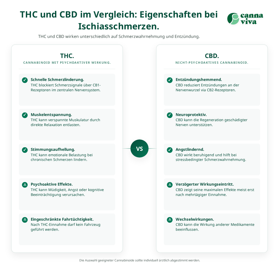 - Zentrale Schmerzblockade: THC bindet an CB1-Rezeptoren im zentralen Nervensystem und kann dadurch die Weiterleitung von Schmerzsignalen effektiv unterbrechen[1]. Diese Wirkung ist besonders bei akuten, stechenden Ischiasschmerzen von Bedeutung, da sie eine schnelle Linderung ermöglichen kann. Studien deuten darauf hin, dass THC die Schmerzintensität deutlich senken kann, wobei individuelle Unterschiede in der Reaktion bestehen.