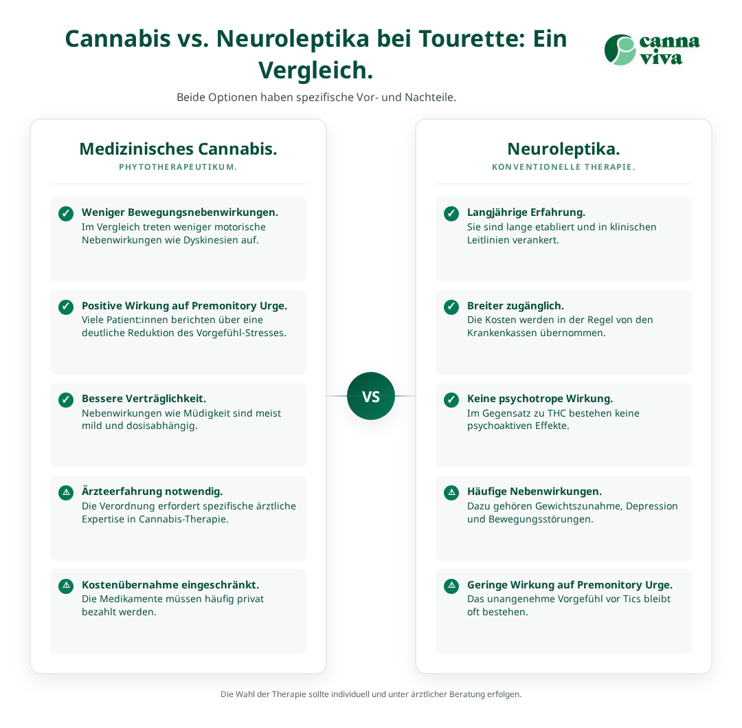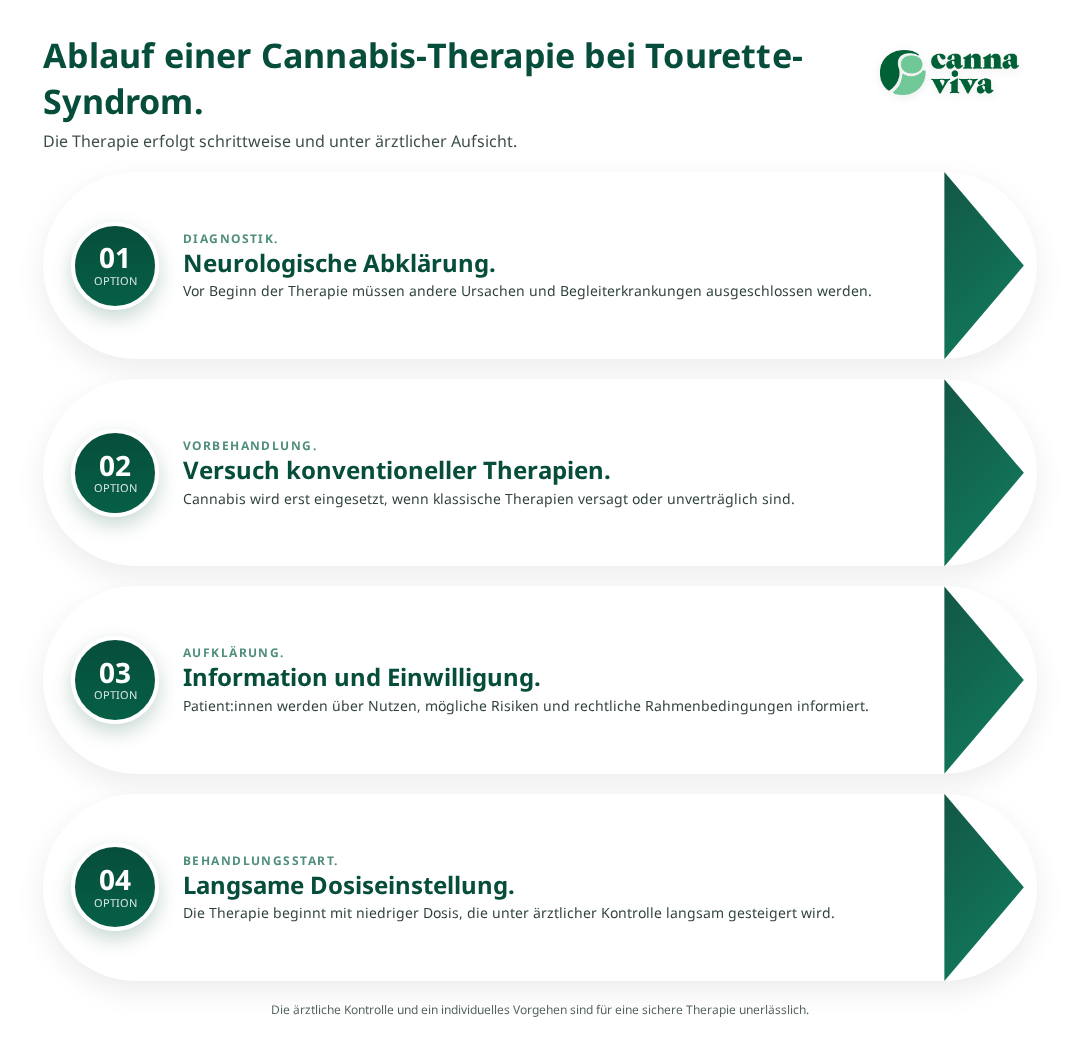 Für Patient:innen mit Tourette-Syndrom, die eine Cannabis-Therapie erwägen, bietet Cannaviva umfassende Unterstützung auf dem Weg zu einer individuell angepassten Behandlung. Das erfahrene medizinische Team versteht die besonderen Herausforderungen, die mit Tic-Störungen einhergehen, und entwickelt gemeinsam mit Ihnen einen massgeschneiderten Therapieplan.