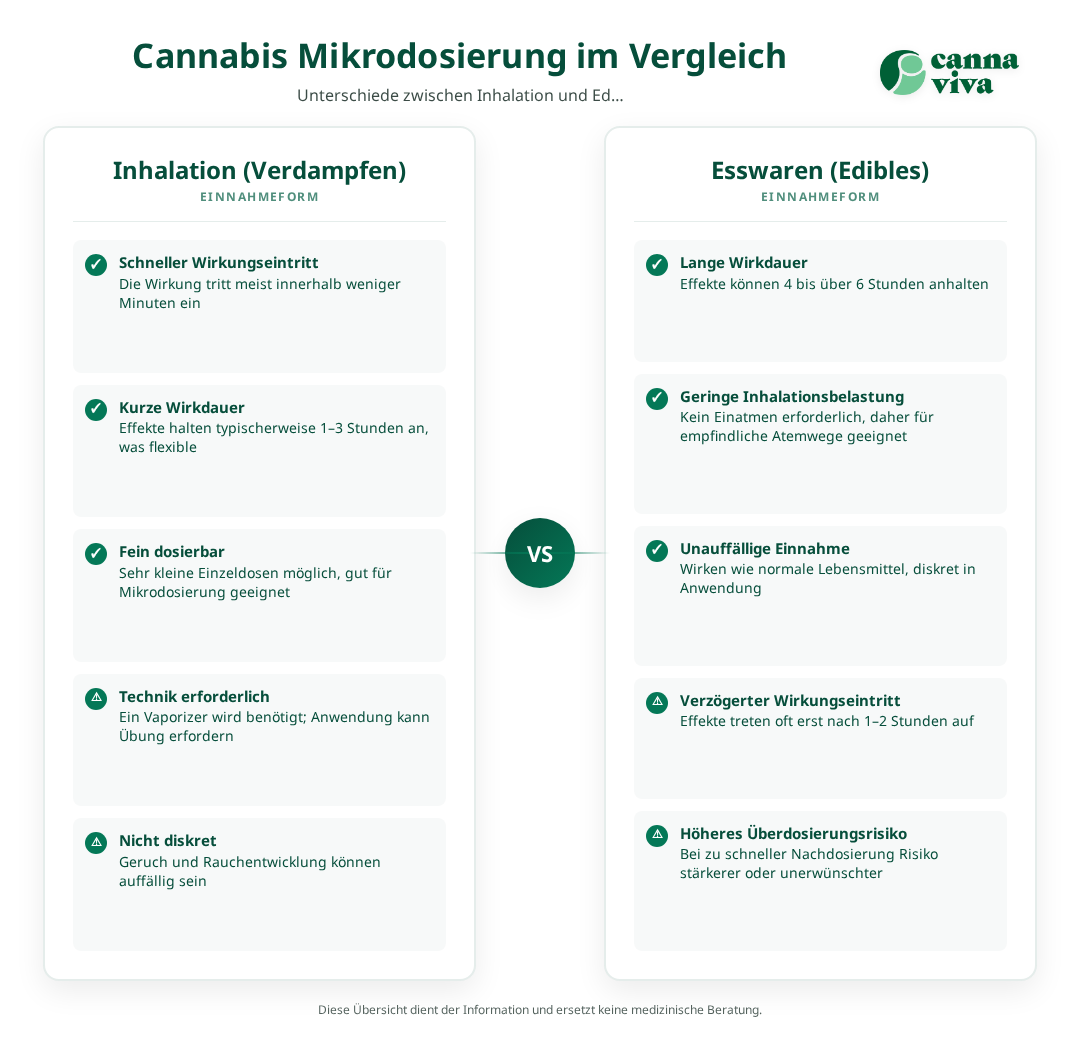 Mikrodosierung beschreibt die Anwendung sehr niedriger Cannabinoidmengen, so dass die psychoaktive Wirkung vermindert oder nicht bewusst wahrnehmbar ist. Ziel ist eine spürbare Symptomverbesserung bei möglichst wenigen Nebenwirkungen. Die konkrete Dosis ist individuell verschieden; entscheidend sind Produktform (Öl, Inhalation, Edibles), Wirkstoffprofil (THC, CBD) und persönliche Empfindlichkeit.