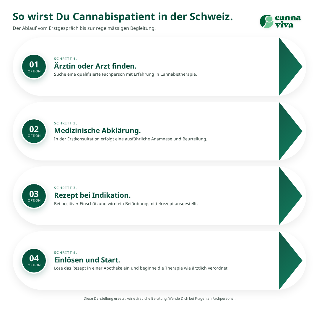 Als führende Schweizer Plattform für Medizinalcannabis begleitet Cannaviva Patientinnen und Patienten durch den gesamten Prozess des Cannabispatient-Werdens. Unser Netzwerk qualifizierter Ärztinnen und Ärzte verfügt über fundierte Erfahrung in der Cannabinoidtherapie und kann eine individualisierte, evidenzbasierte Behandlung anbieten.