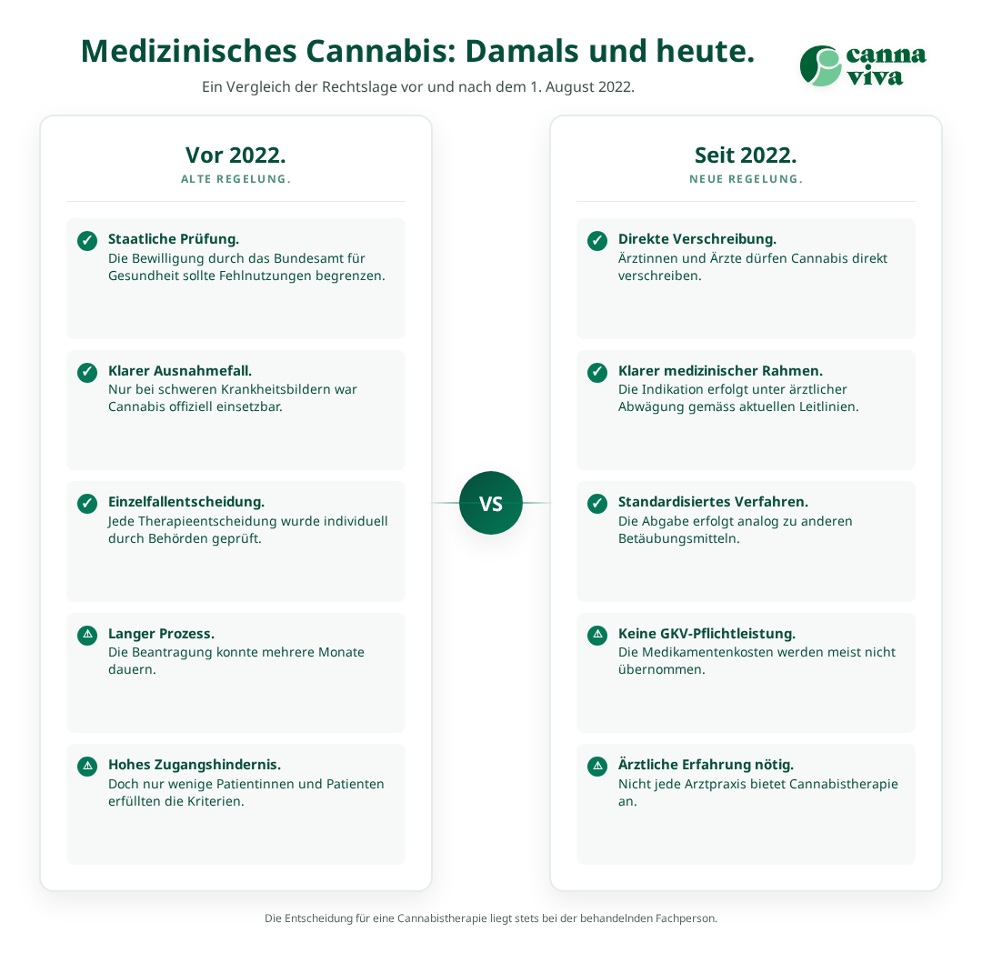 Die Änderung des Betäubungsmittelgesetzes am 1. August 2022 markierte einen Wendepunkt für medizinisches Cannabis in der Schweiz. Vorher benötigten Patientinnen und Patienten eine komplizierte Ausnahmebewilligung vom Bundesamt für Gesundheit, die oft Monate dauerte und nur bei schwerwiegenden Erkrankungen erteilt wurde. Heute können qualifizierte Ärztinnen und Ärzte Cannabisprodukte direkt verschreiben, wenn sie dies medizinisch für angezeigt halten.