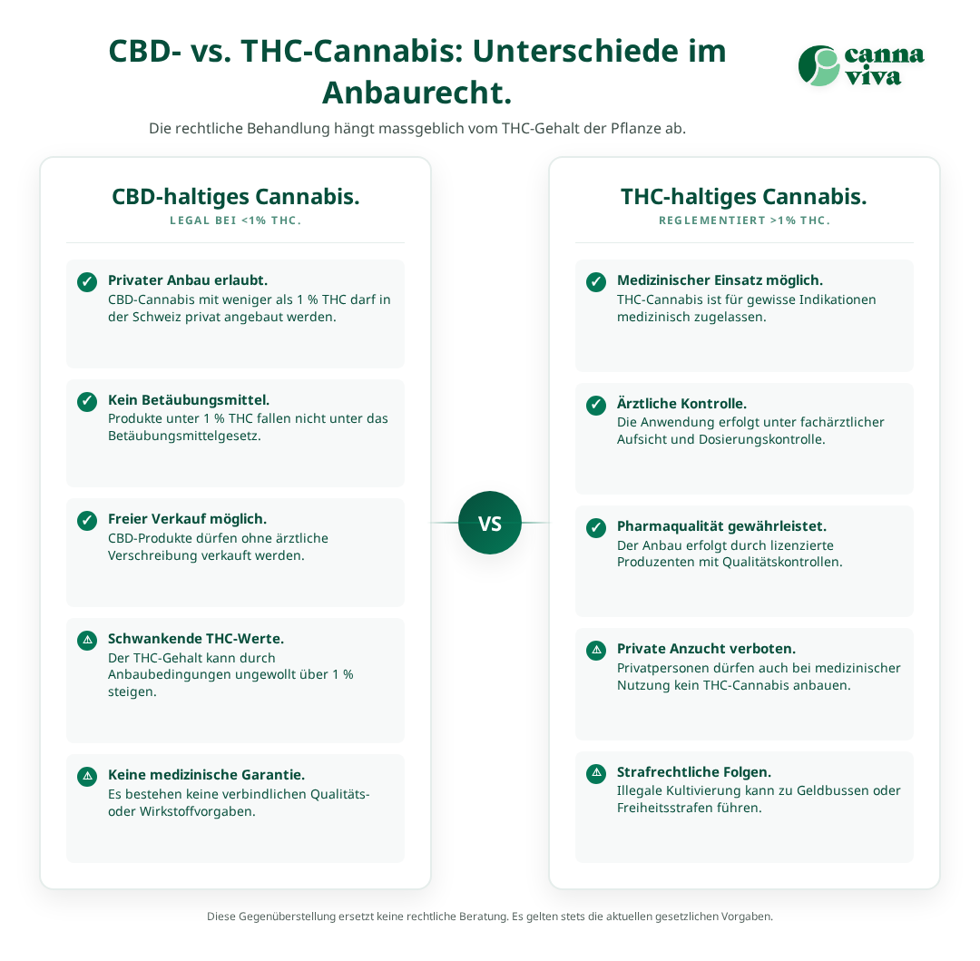 Für das Verständnis der rechtlichen Lage ist die Unterscheidung zwischen CBD- und THC-haltigem Cannabis entscheidend. In der Schweiz sind Cannabis-Produkte mit einem THC-Gehalt von maximal 1 Prozent legal erhältlich und können frei verkauft werden. Diese CBD-Produkte fallen nicht unter das Betäubungsmittelgesetz und können daher auch privat angebaut werden, solange der THC-Gehalt die 1-Prozent-Grenze nicht überschreitet.