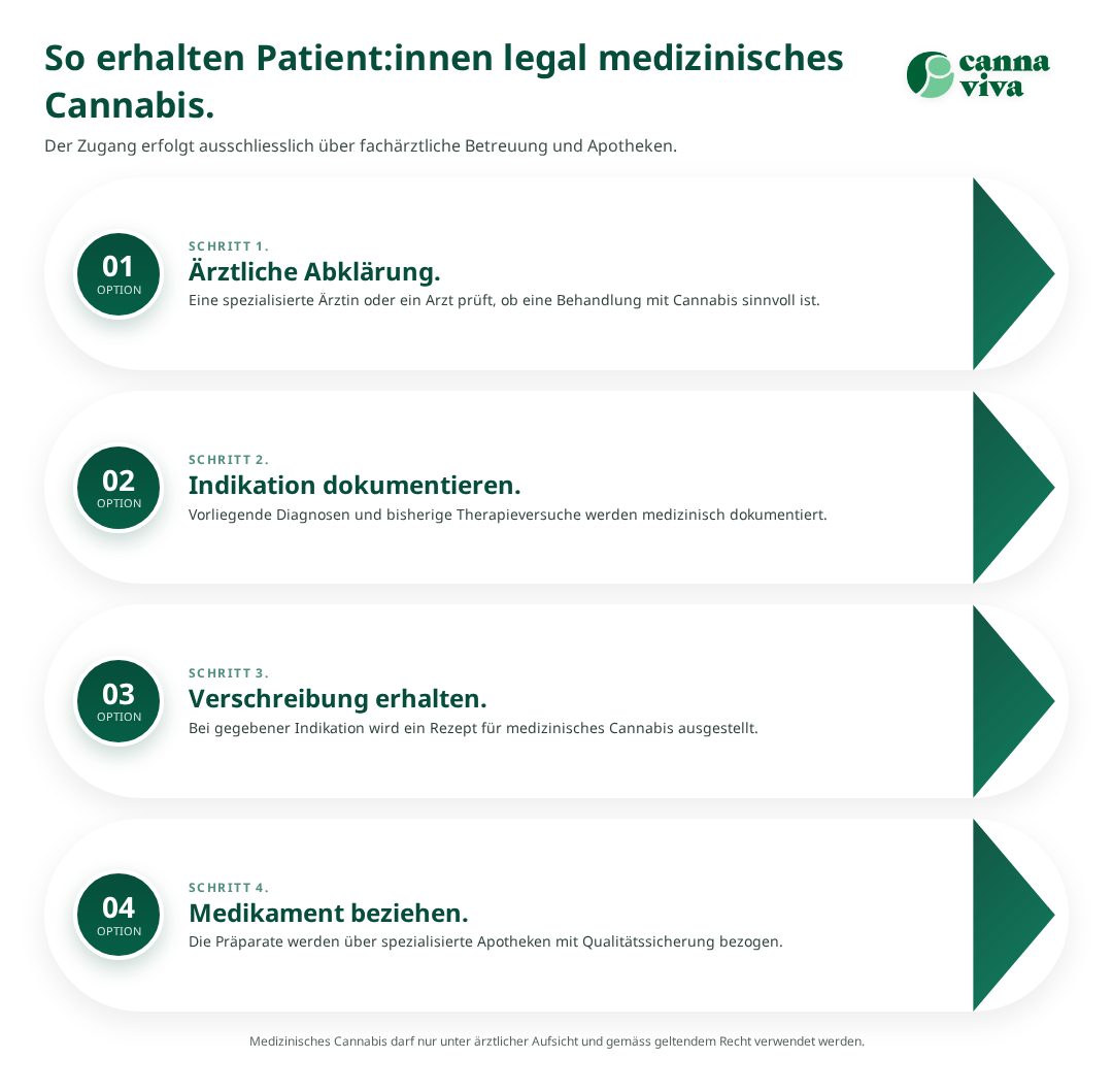 Für Patientinnen und Patienten, die medizinisches Cannabis benötigen, gibt es in der Schweiz inzwischen mehrere legale Wege, ohne selbst Cannabis anbauen zu müssen. Der Hauptweg führt über spezialisierte Ärztinnen und Ärzte, die eine Cannabis-Therapie verschreiben können[5]. Diese Cannabis-Ärzte verfügen über entsprechende Fortbildungen und Erfahrungen in der Cannabinoid-Medizin.