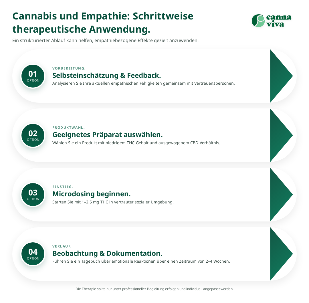 Ein strukturierter Ansatz kann dabei helfen, die Wirksamkeit der Therapie zu maximieren. Achtsamkeitstechniken können die durch Cannabis verstärkte emotionale Wahrnehmung kanalisieren und dabei helfen, zwischen den eigenen Gefühlen und denen der Mitmenschen zu unterscheiden. Meditation oder andere Entspannungsverfahren vor der Cannabis-Anwendung können die Aufnahmebereitschaft für empathische Signale erhöhen und gleichzeitig das Risiko von Überforderung reduzieren.