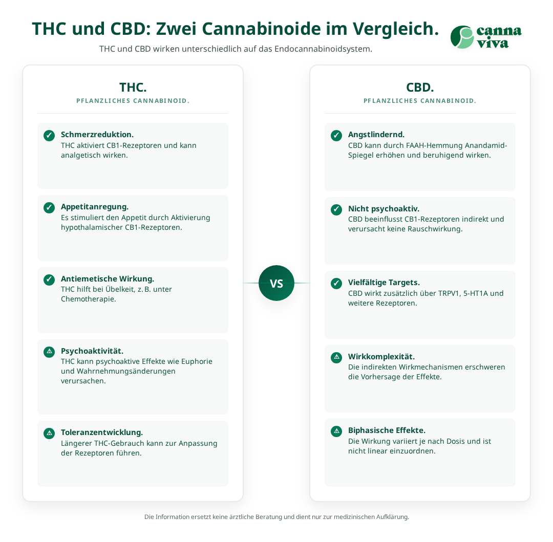 - Indirekte Modulation: CBD hemmt das Enzym FAAH, was zu erhöhten Anandamid-Spiegeln führt. Diese indirekte Verstärkung des ECS kann therapeutische Effekte ohne psychoaktive Nebenwirkungen erzielen. Die körpereigenen Endocannabinoide wirken physiologischer als externe Cannabinoide.