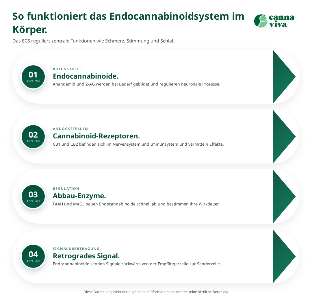 Das Endocannabinoidsystem ist ein komplexes Regulationssystem des menschlichen Körpers, das zentrale Funktionen wie Schmerz, Stress, Schlaf und Immunantworten steuert. Für Schweizer Patienten, die sich für medizinisches Cannabis interessieren, bildet das Verständnis dieses Systems die Grundlage für eine sichere und wirksame Anwendung von Cannabinoidtherapien. Weitere Informationen darüber, wie du ein medizinisches Cannabis Rezept Schweiz erhalten kannst, findest du auf unserer Startseite.