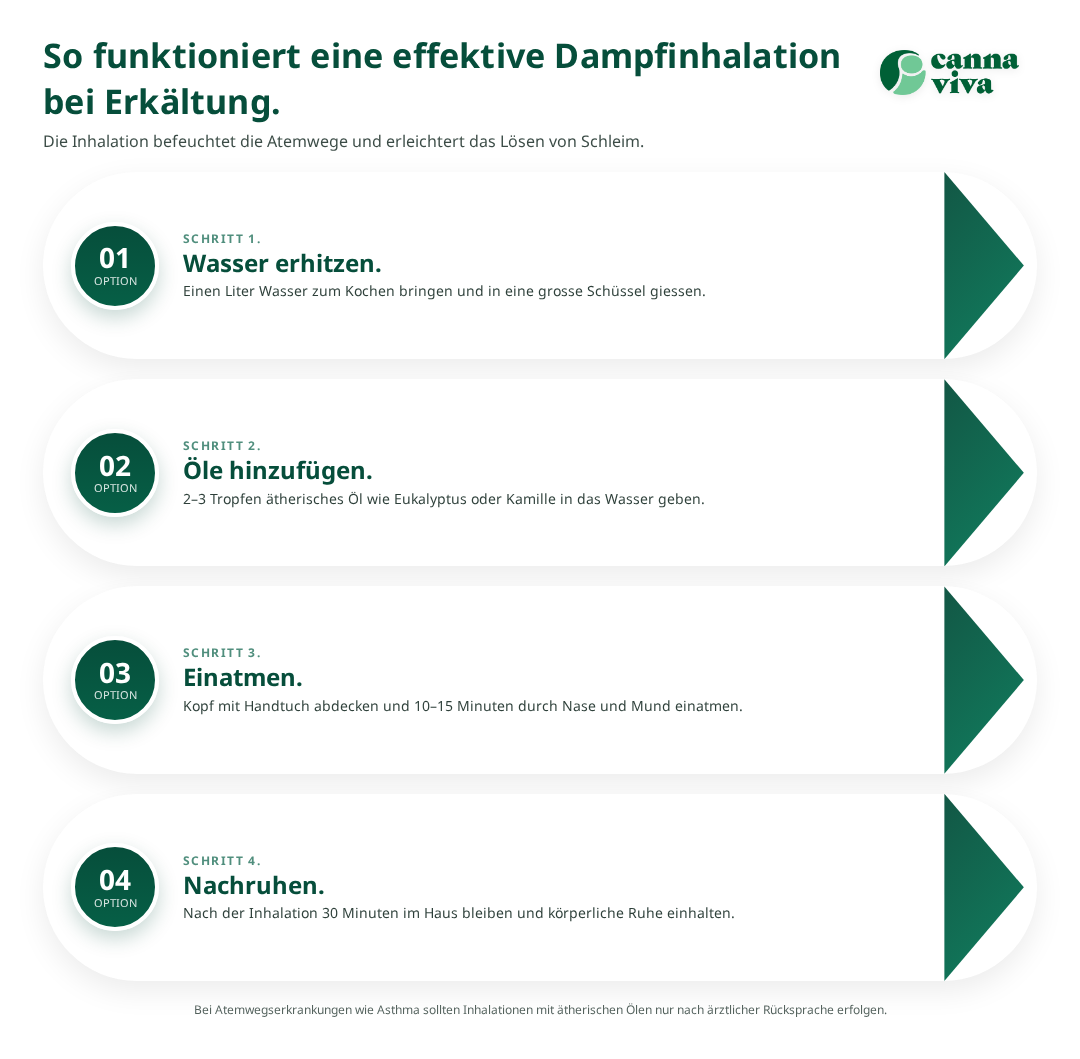 Für eine sichere Anwendung wird heisses, nicht kochendes Wasser verwendet. Der Kopf wird mit einem Handtuch bedeckt, um den Dampf zu konzentrieren. Die Inhalation sollte 10-15 Minuten dauern und zwei- bis dreimal täglich wiederholt werden. Bei ätherischen Ölen genügen wenige Tropfen – zu hohe Konzentrationen können die Schleimhäute reizen und zu Atembeschwerden führen.