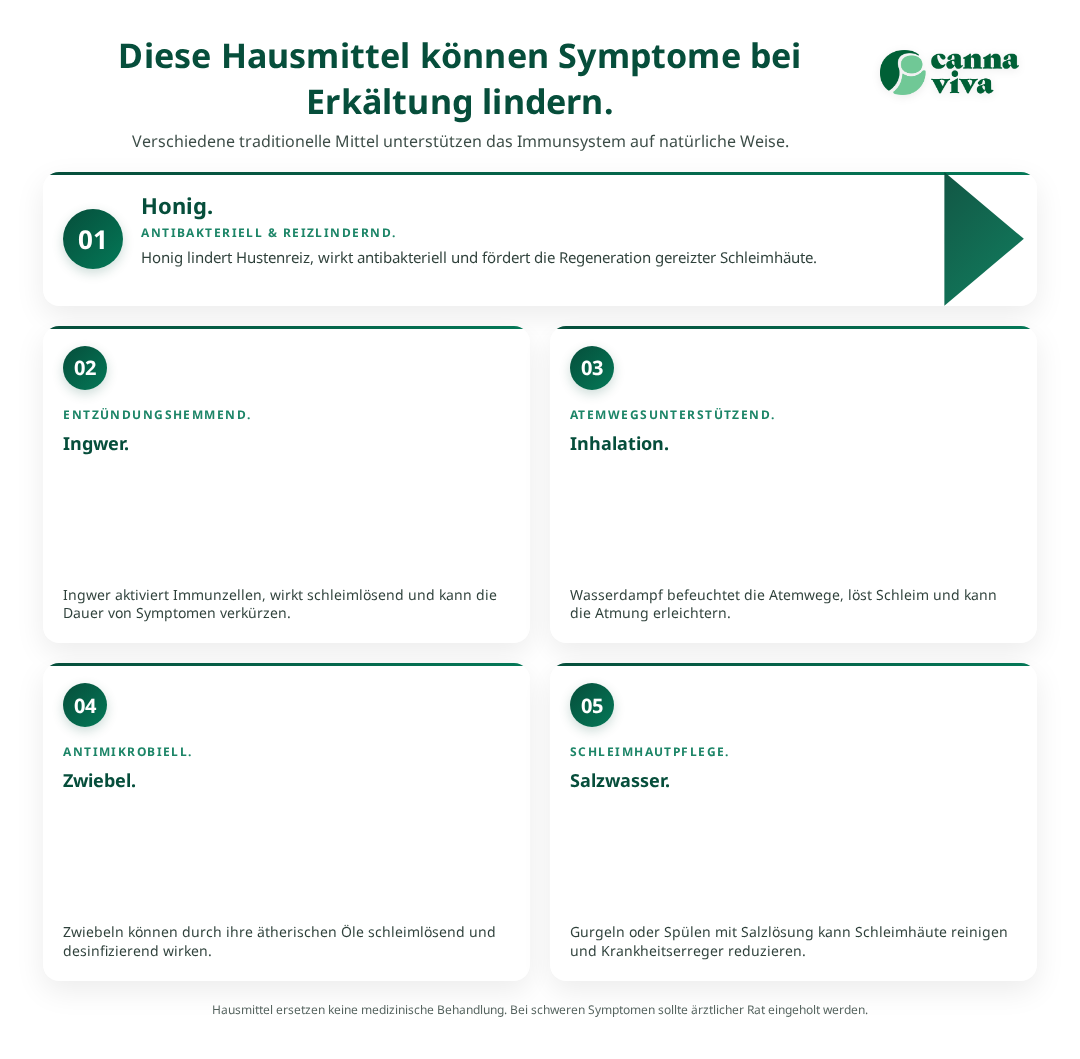 Erkältung und Grippe gehören zu den häufigsten Infektionskrankheiten, besonders in den kühleren Monaten. Bewährte Hausmittel können dabei helfen, Symptome wie Husten, Schnupfen, Halsschmerzen und Fieber auf natürliche Weise zu lindern und das Immunsystem zu stärken. Diese traditionellen Methoden bieten eine sanfte Alternative oder sinnvolle Ergänzung zur konventionellen Behandlung. In der Schweiz setzen viele Menschen erfolgreich auf eine Kombination aus Ruhe, Wärme, ausreichend Flüssigkeit und gezielten pflanzlichen Heilmitteln, um den Krankheitsverlauf zu verkürzen und Beschwerden zu reduzieren.