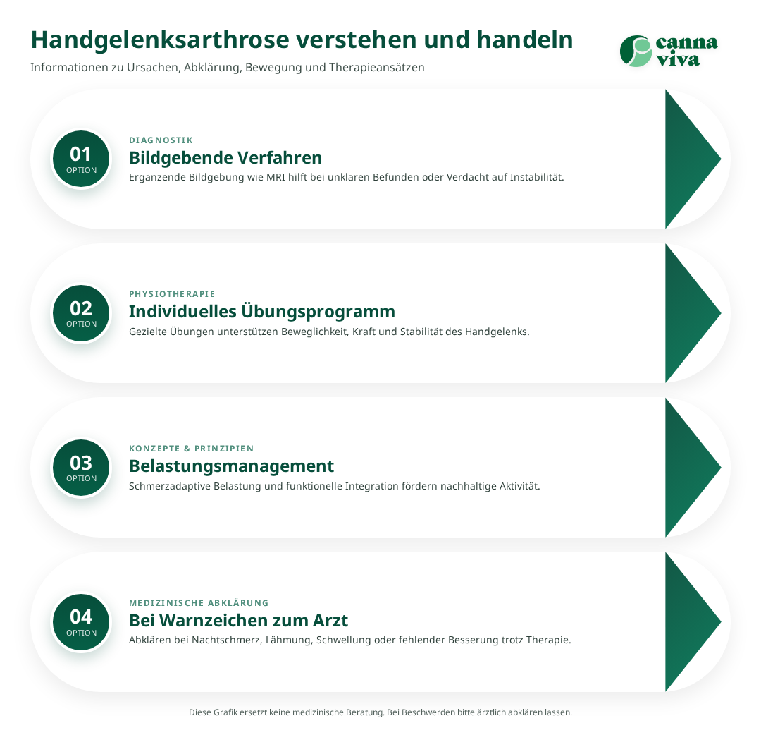Handgelenksarthrose (Osteoarthrose des Handgelenks) betrifft vor allem Personen nach Traumen, bei Fehlstellungen oder nach wiederholter Überlastung und kann Schmerzen, Kraftverlust und eingeschränkte Beweglichkeit verursachen. Ziel dieses Artikels ist, Betroffenen verständliche Informationen zu konservativen Therapieoptionen, sinnvollen Übungen und Hinweisen zur Abklärung zu geben. Die Evidenzlage ist bei konservativen Massnahmen besser für Physiotherapie und Belastungsmanagement als für viele alternative Verfahren; Bildgebung spielt bei unklarer Ursache oder bei Verdacht auf Instabilität eine wichtige Rolle. Bei roten Flaggen (starke nächtliche Schmerzen, neurologische Ausfälle, rasche Verschlechterung) ist eine rasche ärztliche Abklärung nötig.
