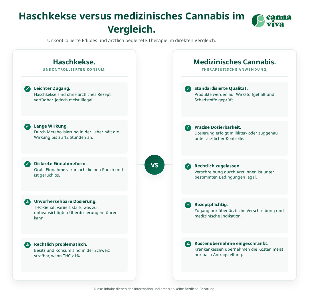 Der Vergleich zwischen Haschkeksen und medizinischem Cannabis zeigt deutliche Unterschiede in Sicherheit, Wirksamkeit und rechtlicher Situation. Während der unkontrollierte Konsum von Cannabis-Edibles erhebliche gesundheitliche und juristische Risiken birgt, bietet medizinisches Cannabis unter professioneller Begleitung eine sichere und effektive Therapieoption. Die präzise Dosierbarkeit, standardisierte Qualität und kontinuierliche ärztliche Überwachung machen die medizinische Anwendung zur klar überlegenen Alternative für Patient:innen, die von den therapeutischen Eigenschaften von Cannabis profitieren möchten.