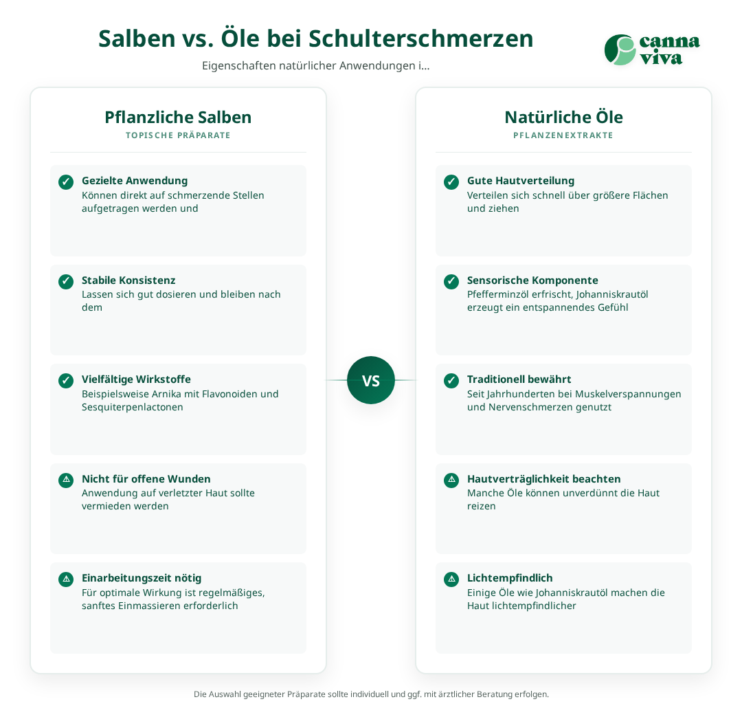 Besonders bei Schulterschmerzen durch Verspannungen oder leichte Entzündungen können traditionelle Anwendungen eine wirksame Unterstützung bieten. Die Kombination aus physikalischen Effekten wie Wärme oder Kälte mit bioaktiven Pflanzeninhaltsstoffen macht viele Hausmittel zu einer sinnvollen Ergänzung der Schmerztherapie.