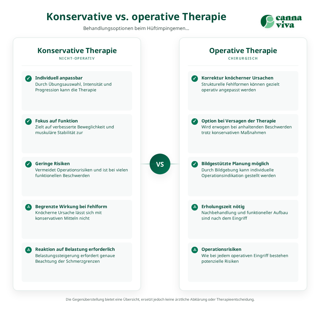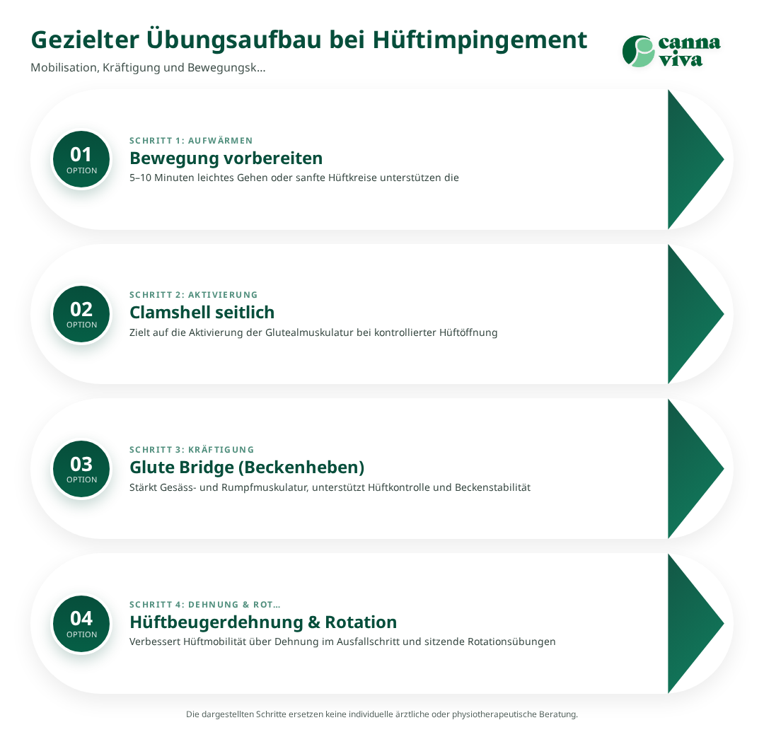 Ein Hüftimpingement (Femoroacetabuläres Impingement, FAI) ist ein mechanisches Zusammenstossen von Hüftknochen, das Bewegungseinschränkungen und Leistenschmerzen verursachen kann. Ziel konservativer Behandlung sind Schmerzreduktion, Verbesserung der Hüftbeweglichkeit und Stabilisierung der umgebenden Muskulatur. Übungen sollten gezielt mobilisieren, dehnen und kräftigen; Dosierung und Progression richten sich nach Schmerzreaktion. Bei anhaltenden Symptomen oder starken funktionellen Einschränkungen ist eine fachärztliche Abklärung sinnvoll.