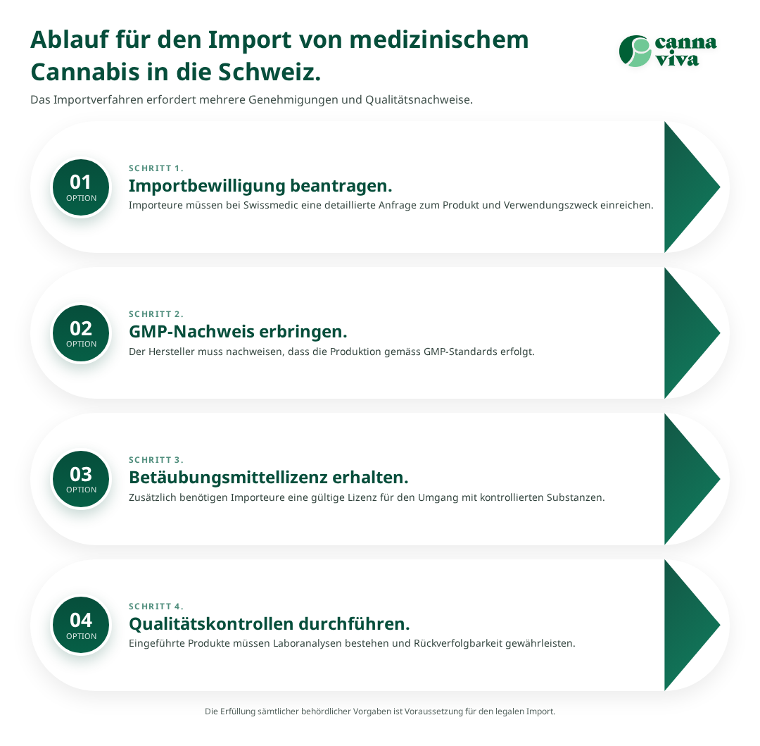 Unternehmen, die medizinisches Cannabis in die Schweiz importieren möchten, müssen mehrere regulatorische Schritte durchlaufen.[2] Der Prozess beginnt mit der Beantragung einer Importbewilligung bei Swissmedic, die detaillierte Informationen über das zu importierende Produkt, dessen Herkunft und die geplante Verwendung erfordert.