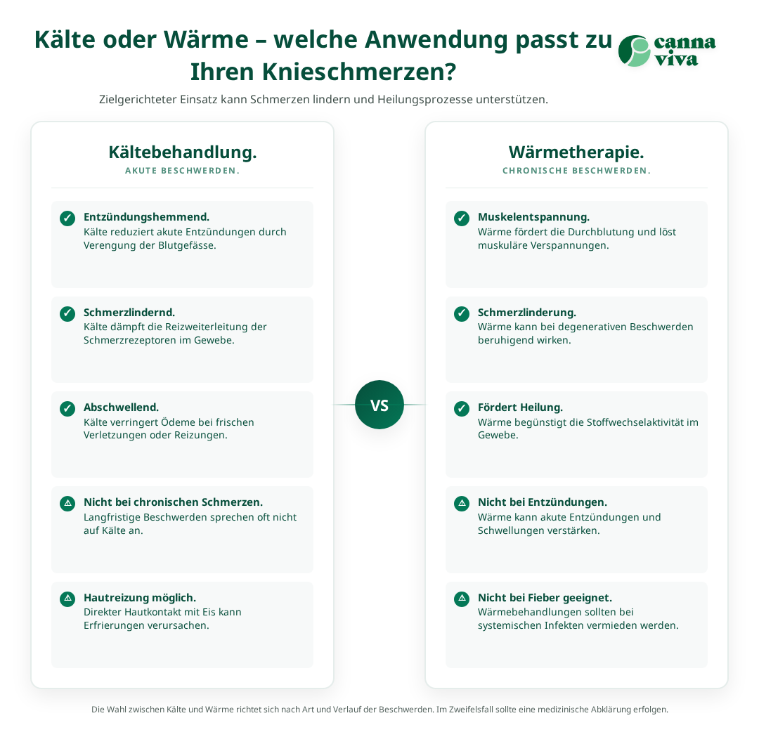 Die gezielte Anwendung von Wärme und Kälte gehört zu den grundlegenden physikalischen Therapiemassnahmen bei Knieschmerzen[5]. Beide Methoden wirken über unterschiedliche Mechanismen und sollten je nach Art und Stadium der Beschwerden eingesetzt werden. Kälteanwendungen sind besonders bei akuten Entzündungen und Schwellungen wirksam, während Wärme bei chronischen Schmerzen und Muskelverspannungen hilft.