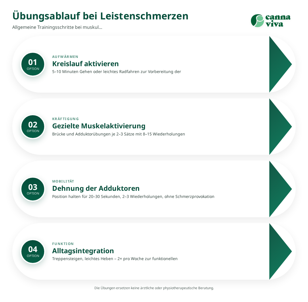 Therapie und Übungen richten sich nach der Ursache: Bei muskulären Problemen sind gezielte Kräftigungs- und Dehnübungen für Adduktoren, Hüftbeuger und Rumpf sinnvoll; bei strukturellen Problemen (z. B. Hernie, Hüftarthrose) erfolgt die Therapie abgestimmt mit Fachpersonen. Prinzipien: langsam aufbauen, Schmerzmessung als Leitfaden (kein scharfer, stechender Schmerz), Regelmässigkeit (z. B. 3× pro Woche) und funktionelle Integration in Alltagsbewegungen.