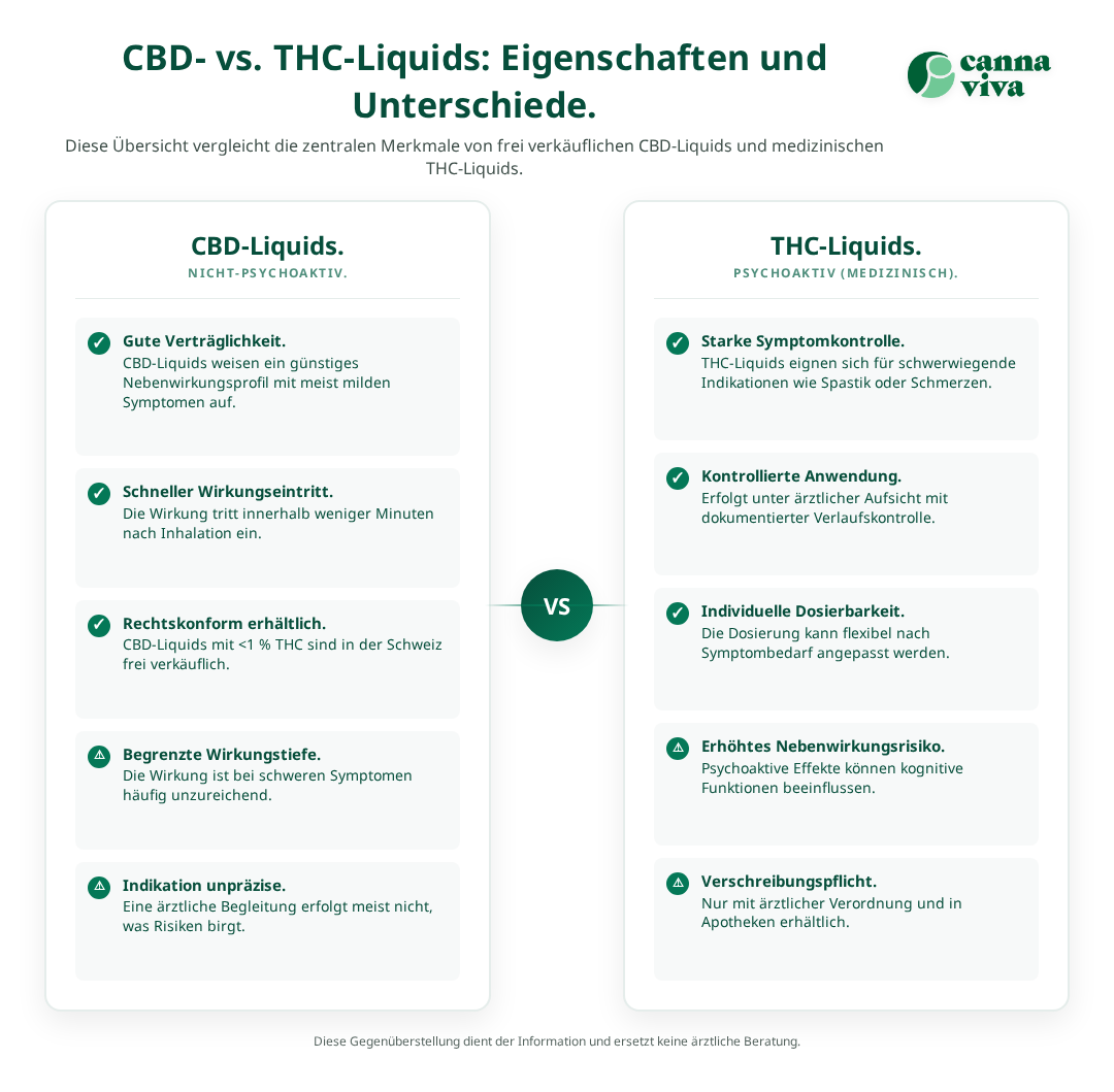- THC-Liquid (medizinisch): psychoaktiv, verschreibungspflichtig, stärkere Wirkung, ärztliche Kontrolle nötig