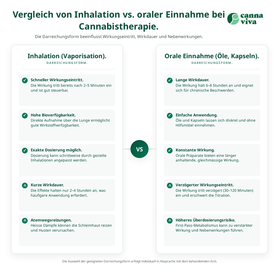 Die individuelle Dosierung hängt von der Cannabinoidkonzentration, der Toleranz des Patienten und der Schwere der Symptome ab. Erfahrene Anwender können ihre optimale Dosis meist selbst titrieren.
