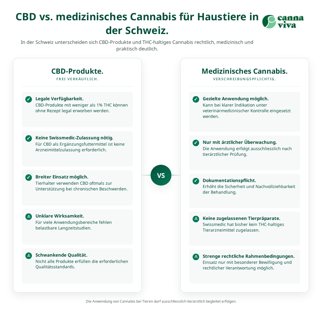 Die Schweizer Gesetzgebung unterscheidet klar zwischen CBD-haltigen Produkten und medizinischem Cannabis mit höheren THC-Konzentrationen. Während CBD-Produkte mit einem THC-Gehalt unter 1% frei verkäuflich sind[1], unterliegt medizinisches Cannabis strengen Regulierungen. Bei Tieren kommen zusätzliche veterinärmedizinische und tierschutzrechtliche Aspekte hinzu, die eine sorgfältige Abwägung erfordern.