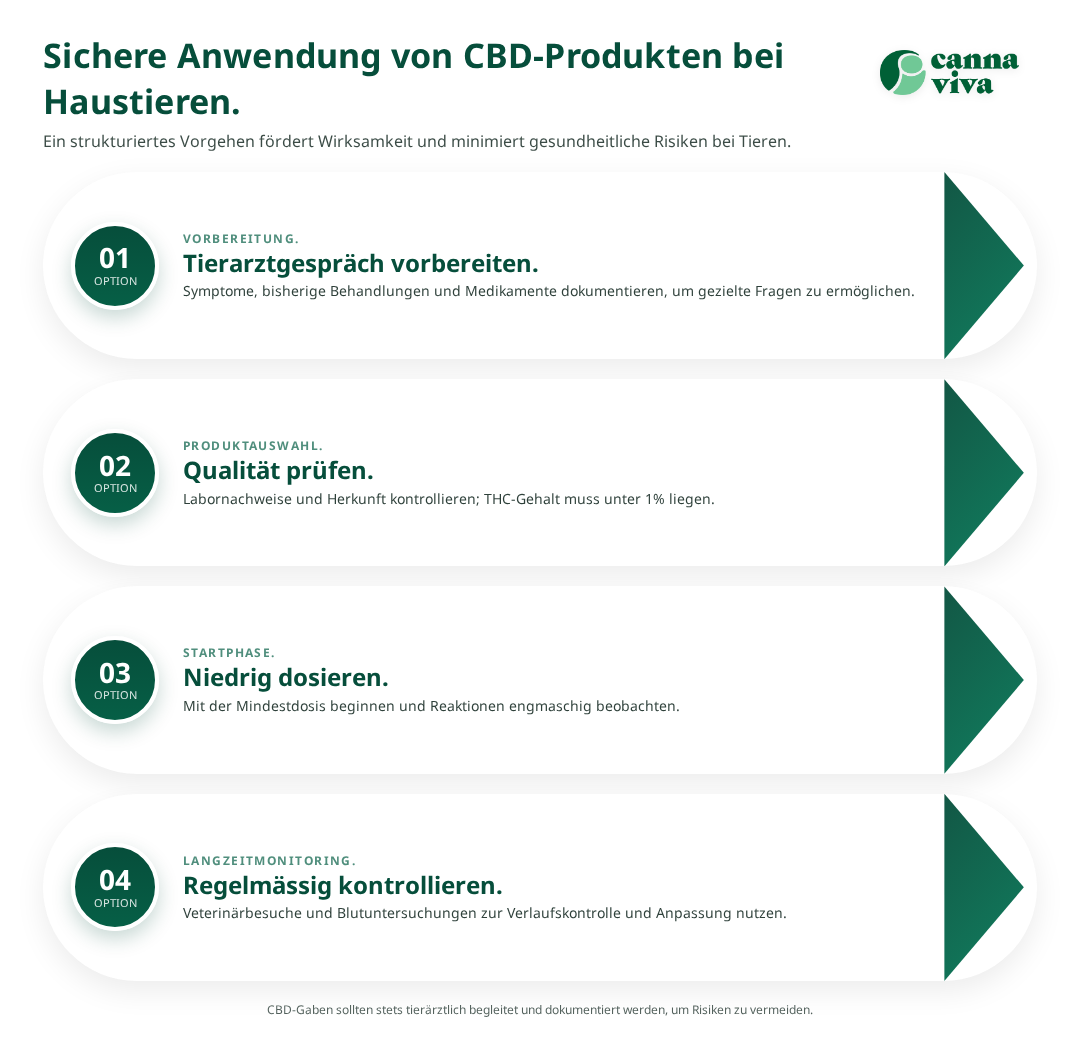 Tierhalter, die Cannabinoid-basierte Therapien für ihre Haustiere erwägen, sollten einen strukturierten Ansatz verfolgen[7]. Dies gewährleistet sowohl die Sicherheit des Tieres als auch die Einhaltung rechtlicher Bestimmungen. Eine enge Zusammenarbeit mit dem behandelnden Tierarzt ist dabei unerlässlich.
