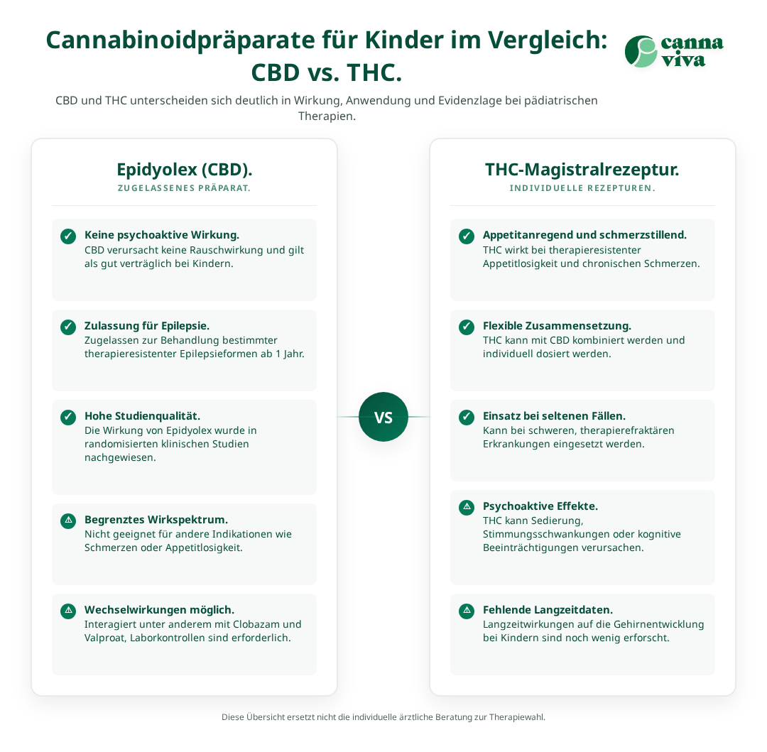 THC-haltige Cannabispräparate für Kinder erfordern weiterhin besondere Vorsichtsmassnahmen und eine individuelle Nutzen-Risiko-Bewertung. Die Verschreibung erfolgt nur durch Ärzte mit entsprechender Erfahrung in der Cannabinoidmedizin und bei Erkrankungen, bei denen konventionelle Therapien nicht ausreichend wirksam sind oder schwere Nebenwirkungen verursachen.