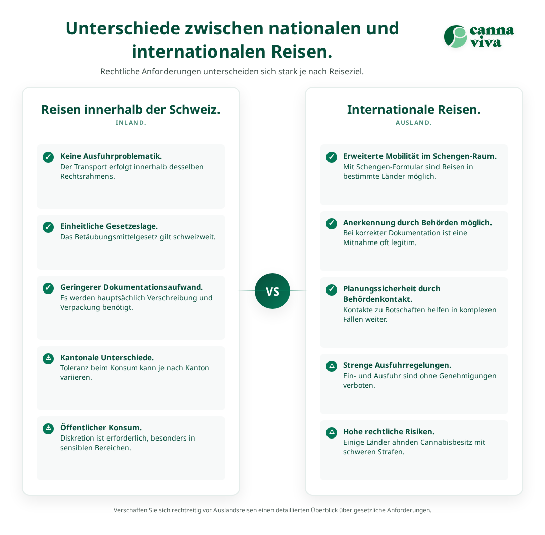 Reisen ins Ausland mit medizinischem Cannabis erfordern deutlich mehr Vorbereitung und rechtliche Absicherung als nationale Reisen.[1] Die Gesetze variieren erheblich zwischen verschiedenen Ländern, und was in der Schweiz legal ist, kann anderswo zu schwerwiegenden rechtlichen Problemen führen. Patient:innen müssen sich vor jeder Auslandsreise gründlich über die Bestimmungen des Ziellandes informieren.