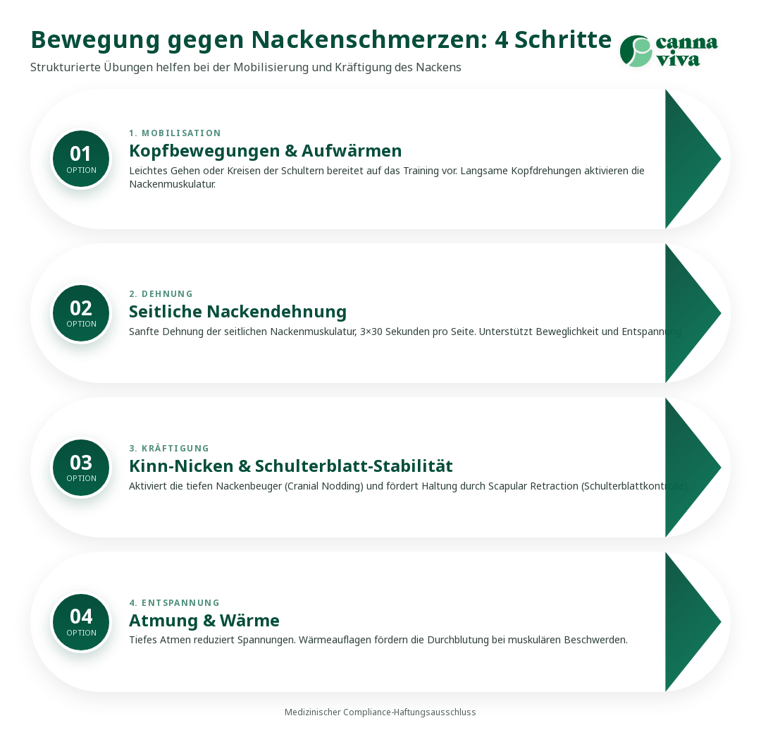 - Mobilisation: langsame Kopfdrehungen 8–10× pro Seite, keine ruckartigen Bewegungen.