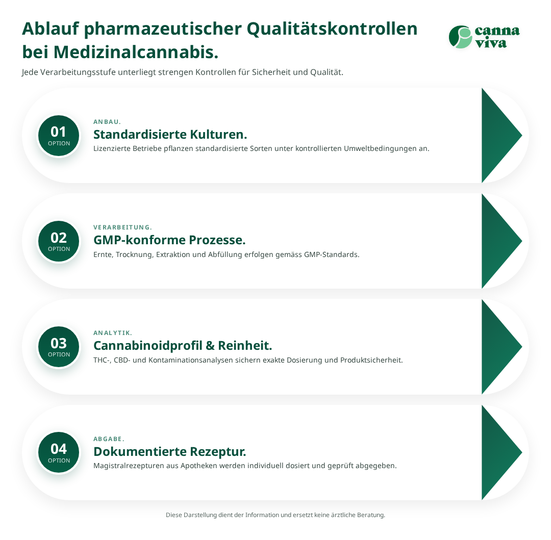 Checkliste für Patienten: Achten Sie bei Cannabisprodukten auf: (1) aktuelle Analysezertifikate, (2) klare Dosierungsangaben, (3) GMP-Hinweise oder Apothekerzubereitung, (4) professionelle Verpackung, (5) keine sichtbaren Verunreinigungen.