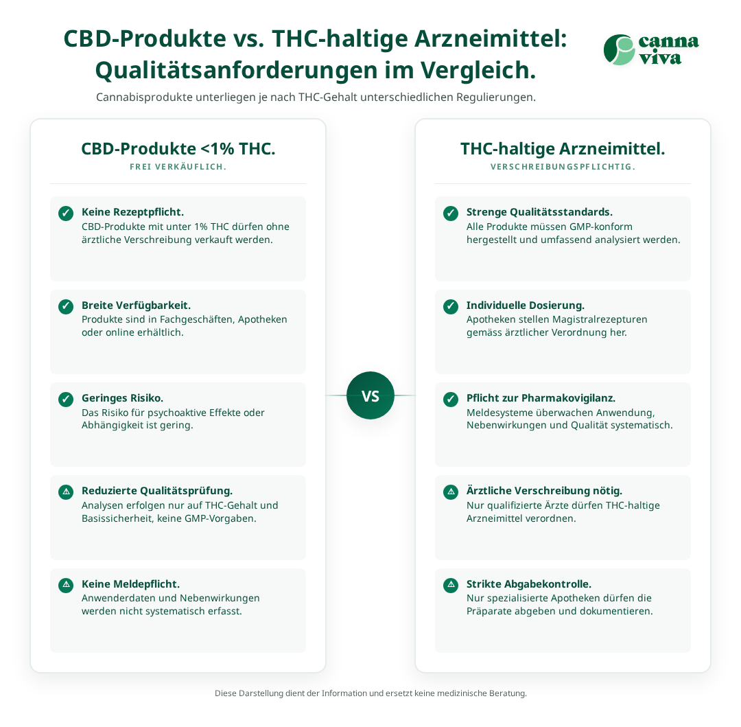 Ein zentraler Unterschied besteht zwischen CBD-Produkten mit weniger als 1% THC, die nicht der Meldepflicht unterliegen, und THC-haltigen Cannabisarzneimitteln, die umfassende Dokumentations- und Meldeverpflichtungen mit sich bringen. Diese Unterscheidung ist fundamental für das Verständnis der verschiedenen Qualitätsstufen.