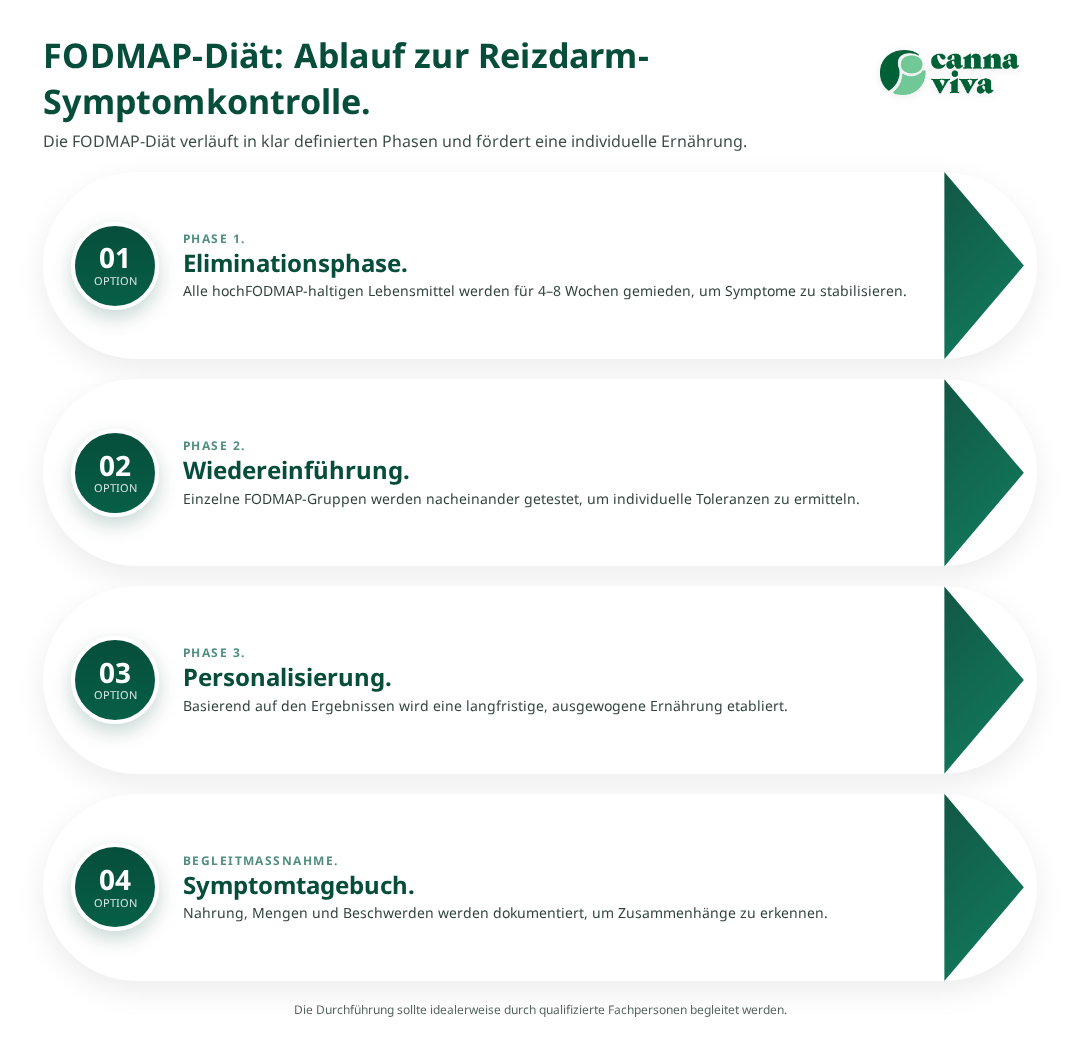Die erste Phase der FODMAP-Diät umfasst eine vier- bis achtwöchige strikte Eliminationsphase, in der alle hochFODMAP-haltigen Lebensmittel gemieden werden.[3] Diese Phase dient dazu, das Verdauungssystem zu beruhigen und eine Ausgangsbasis für die spätere Testung zu schaffen.