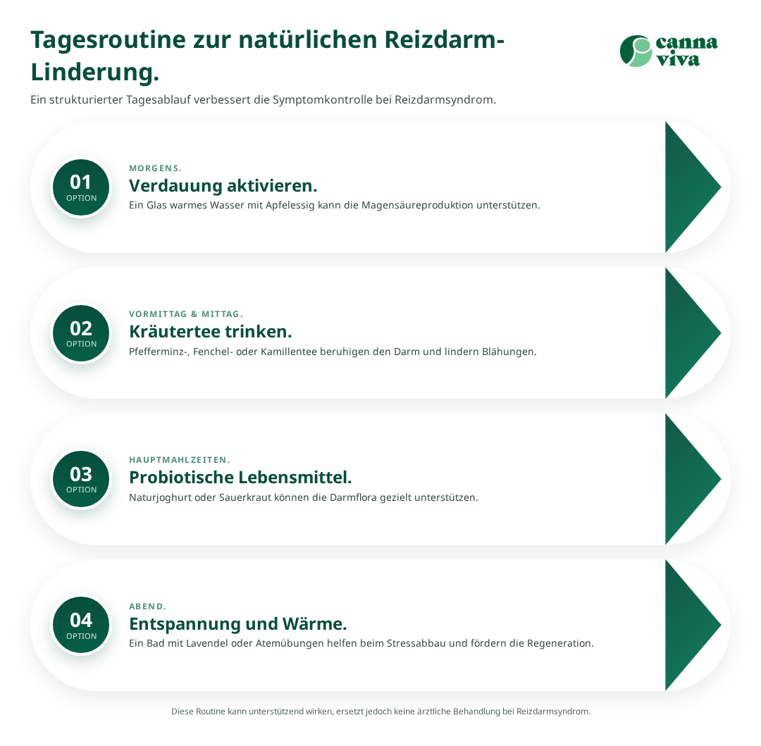 Ein strukturierter Tagesablauf kann sowohl die Verdauung als auch das allgemeine Wohlbefinden verbessern. Der Tag sollte mit einem Glas warmem Wasser beginnen, optional mit Zitrone oder Apfelessig, um die Verdauung zu aktivieren. Zu den Mahlzeiten empfiehlt sich die Einnahme von verdauungsfördernden Tees, 30 Minuten vor oder nach dem Essen. Zwischendurch können bei Bedarf krampflösende Kräutertees getrunken werden. Abends sind entspannende Rituale wie ein warmes Bad oder Atemübungen hilfreich. Ein Ernährungs- und Symptomtagebuch hilft dabei, wirksame Hausmittel zu identifizieren und Auslöser zu vermeiden.