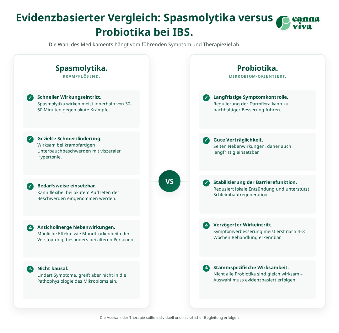 Krampflösende Medikamente wie Butylscopolamin (Buscopan) wirken direkt auf die glatte Muskulatur des Darms und können akute Schmerzepisoden effektiv lindern[1]. Die anticholinerge Wirkung entspannt die Darmwand und reduziert damit die für das Reizdarmsyndrom typischen spastischen Kontraktionen.