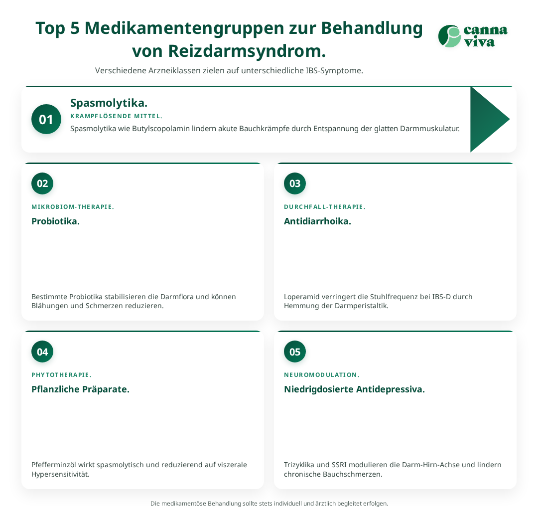 Basierend auf aktueller Evidenz und klinischer Erfahrung haben sich fünf Hauptkategorien von Medikamenten als besonders wirksam bei der Behandlung des Reizdarmsyndroms erwiesen. Jede Gruppe zielt auf spezifische Aspekte der Erkrankung ab und kann je nach individuellem Symptomprofil eingesetzt werden.