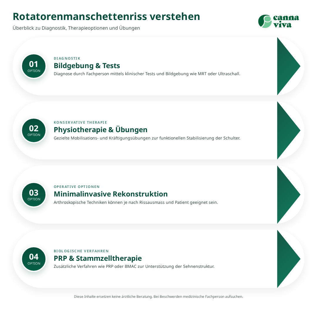 Dieser Artikel richtet sich an Personen mit Verdacht auf einen Riss der Rotatorenmanschette (Sehnenruptur der Schulter) sowie an Angehörige und Therapeuten, die sich über evidenzbasierte Behandlungsmöglichkeiten informieren möchten. Er fasst konservative und operative Optionen, Übungsprinzipien, Sicherheitshinweise und häufige Fehler zusammen. Die Aussagen stützen sich auf aktuelle systematische Reviews und randomisierte Studien, sind aber allgemein gehalten und ersetzen keine individuelle Abklärung. Bei Hinweisen auf ernsthafte Funktionsausfälle oder Red‑Flags ist eine rasche ärztliche Abklärung nötig.