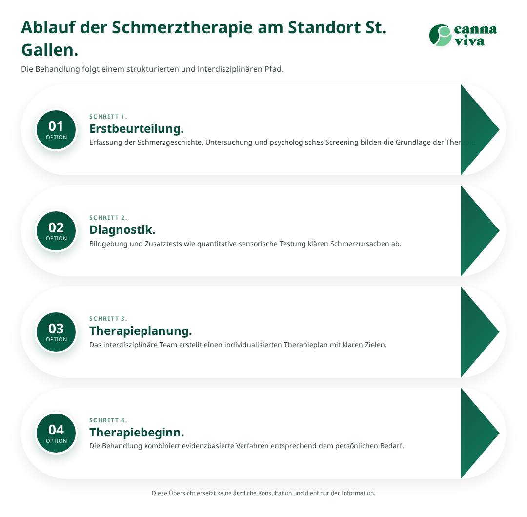 Cannaviva bietet umfassende Unterstützung für Patienten, die eine professionelle Schmerztherapie in St. Gallen suchen. Als Schweizer Plattform für medizinisches Cannabis und Cannabinoidtherapie verfügt Cannaviva über fundierte Erfahrung in der Behandlung chronischer Schmerzen und arbeitet mit qualifizierten Ärzten zusammen.