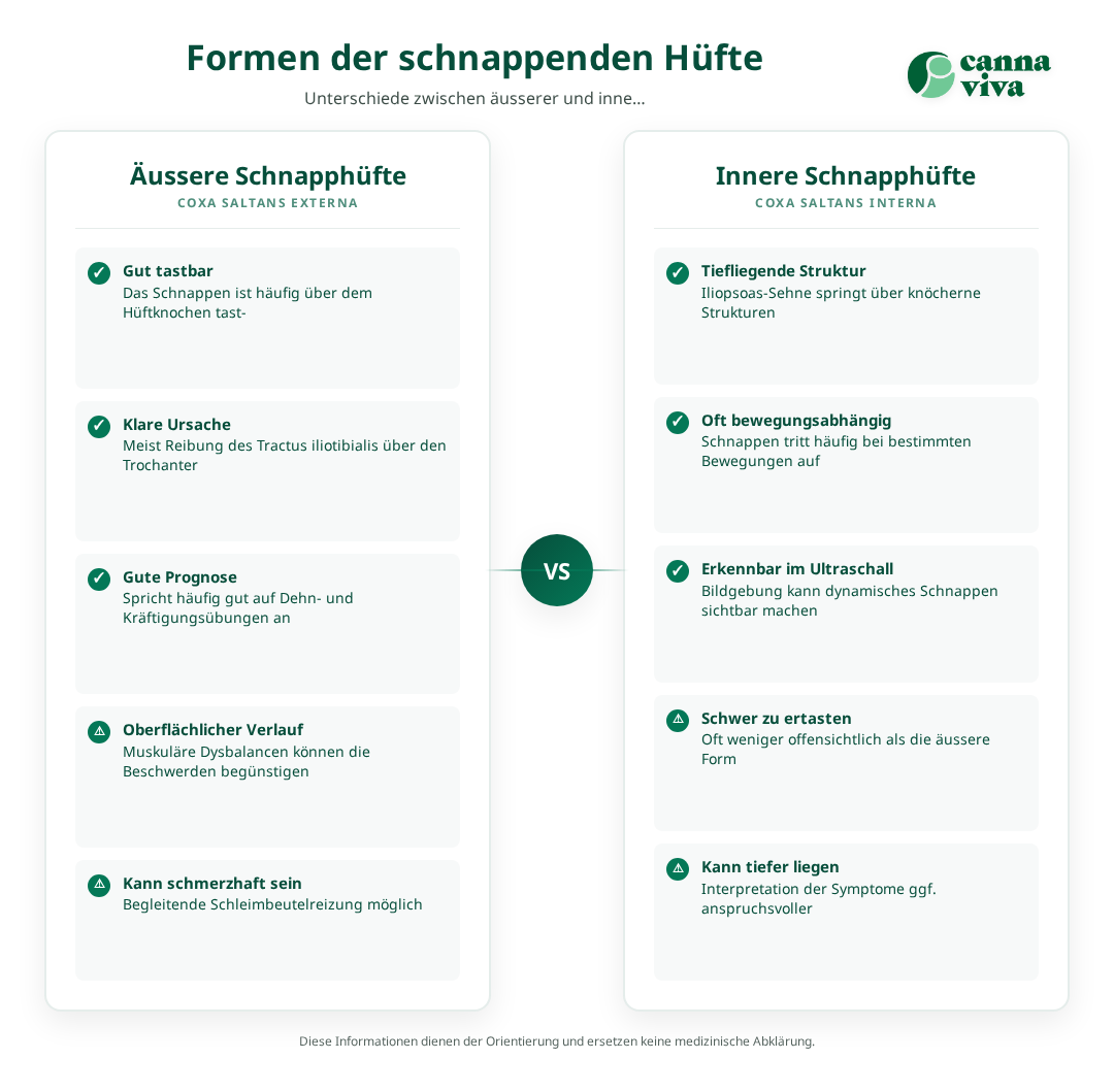 Unter Coxa saltans versteht man wiederkehrendes Schnappen der Hüfte während Bewegung. Man unterscheidet grob drei Formen: äussere Schnapphüfte (Tractus-iliotibialis-Reibung über den grössten Rollhöcker), innere Schnapphüfte (Iliopsoas-Sehne springt über Knochenstrukturen) und intraartikuläre Varianten, bei denen Gelenkstrukturen (z. B. Labrum) beteiligt sind. Das Schnappen kann rein mechanisch sein ohne entzündliche Zeichen oder begleitet von Reibungsschmerzen.