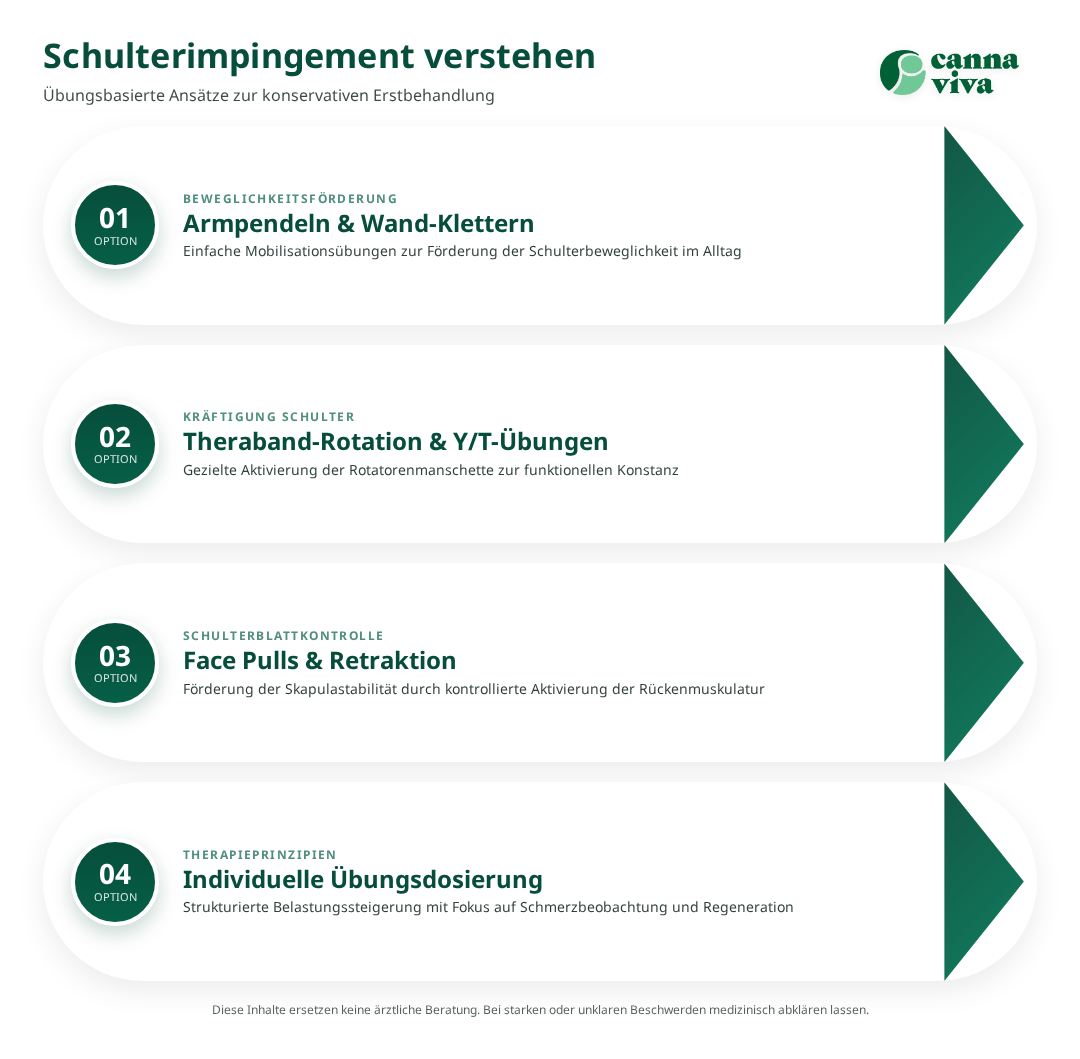 Konservative Behandlung beim Schulterimpingement konzentriert sich auf drei Säulen: Mobilität (Raumerweiterung im Subakromialraum), Kräftigung (Rotatorenmanschette und Skapulamuskulatur) und neuromotorische Kontrolle (korrekte Schulterblattbewegung). Kurzfristig können Schonung und entzündungshemmende Massnahmen sinnvoll sein, mittelfristig haben progressive Kräftigungsprogramme und korrigiertes Bewegungsmuster die besten Erfolgsaussichten. Manualtherapie und gezielte Mobilisationen ergänzen das Training, dienen aber meist als Begleitmassnahme zur aktiven Rehabilitation.