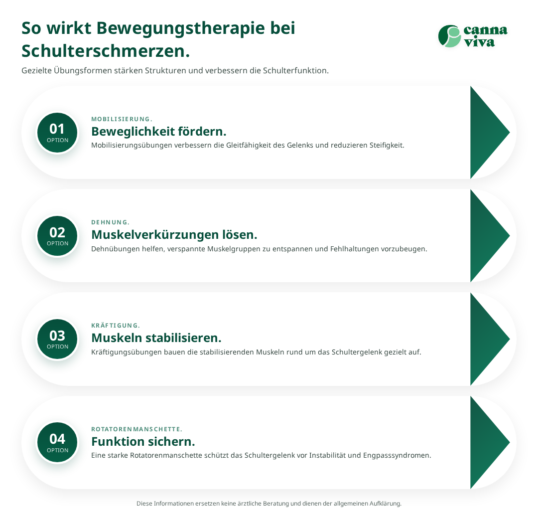Gezielte Bewegungsübungen wirken diesen Problemen auf mehreren Ebenen entgegen. Sie verbessern die Durchblutung der Schultermuskulatur, fördern die Beweglichkeit der Gelenkkapsel und stärken die stabilisierenden Muskeln rund um das Schultergelenk. Studien zeigen, dass eine kombinierte Therapie aus Mobilisierung, Dehnung und Kräftigung bei den meisten Formen von Schulterschmerzen zu deutlichen Verbesserungen führt.[1]