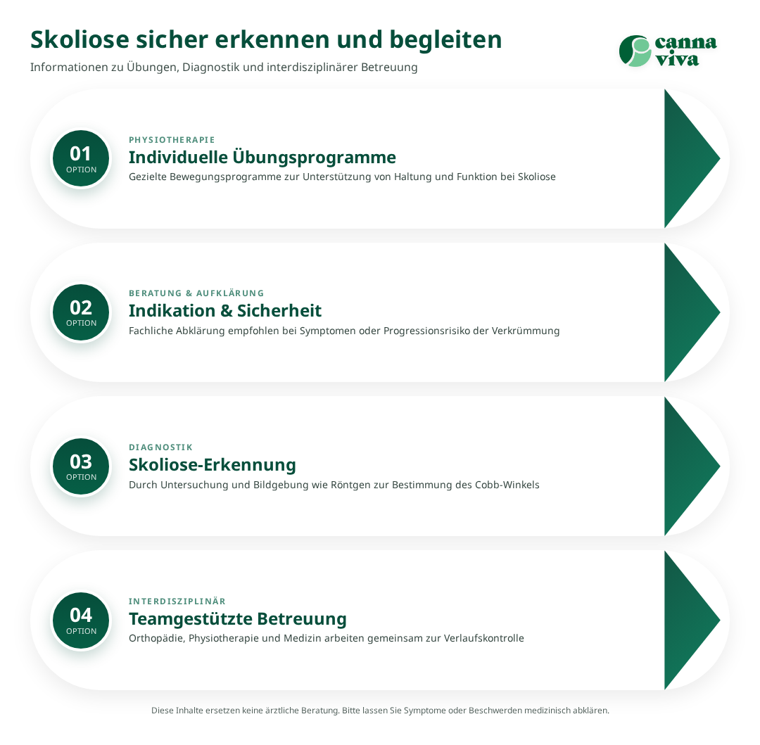 Dieser Artikel richtet sich an Jugendliche und Erwachsene mit leichter bis moderater Skoliose sowie an Angehörige und Fachpersonen, die praktische, evidenzbasierte Übungs‑ und Behandlungsoptionen suchen. Er erklärt Ursachen, typische Symptome und die Rolle von Physiotherapie, spezifischen Übungsprogrammen und ggf. operativen Massnahmen. Die Evidenzbasis zu übungstherapeutischen Programmen zeigt bei individuell angepassten Programmen positive Effekte auf Haltung und Funktion1, dennoch sind Abklärung und Verlaufskontrolle durch Fachpersonen wichtig. Dieser Text betont Sicherheit, Red Flags und klare Indikationen, wann eine fachärztliche Vorstellung notwendig ist.