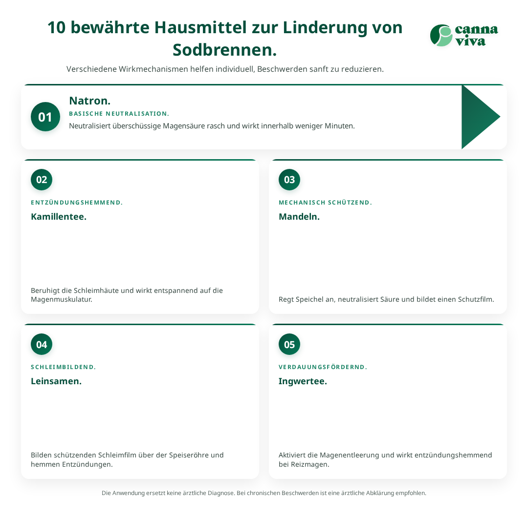 Wenn du dir unsicher bist, was machen gegen Sodbrennen am besten hilft, probiere zuerst einfache Hausmittel für Sodbrennen aus. In der Schweiz setzen viele Menschen auf bewährte, natürliche Mittel, bevor sie zu Medikamenten greifen. Hier findest du unsere besten Empfehlungen: