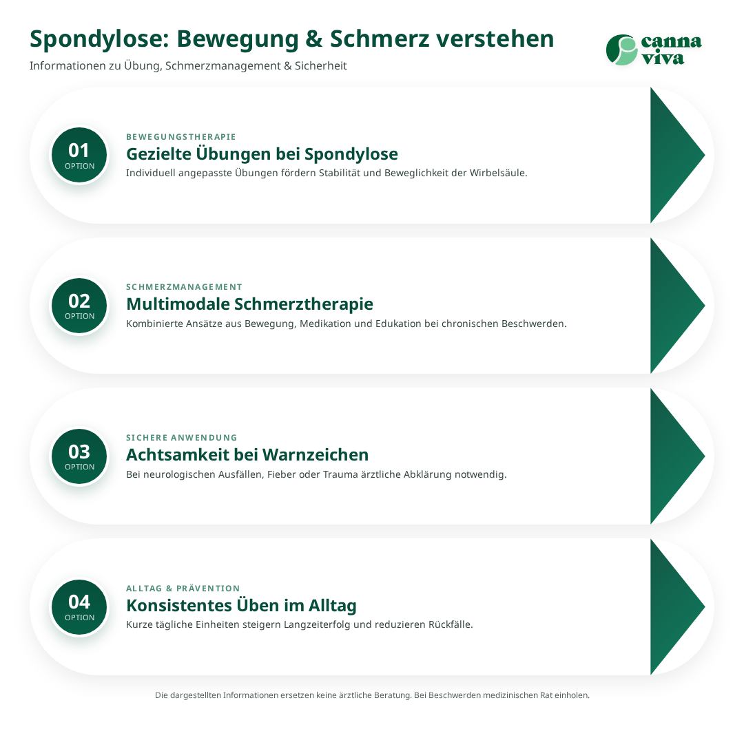 Dieser Artikel richtet sich an Erwachsene mit der Diagnose Spondylose oder an Personen mit chronischen Wirbelsäulenbeschwerden, die sich über konservative Behandlungsoptionen und Schmerztherapie informieren möchten. Er fasst evidenzbasierte Ansätze zusammen, erklärt übliche Übungsprinzipien und betont Sicherheitsaspekte. Die Empfehlungen beruhen auf systematischen Übersichten und randomisierten Studien, wobei Grenzen der Evidenz klar benannt werden. Bei Neuauftritten neurologischer Ausfälle, starken Schmerzen oder Unsicherheit ist eine fachärztliche Abklärung notwendig.