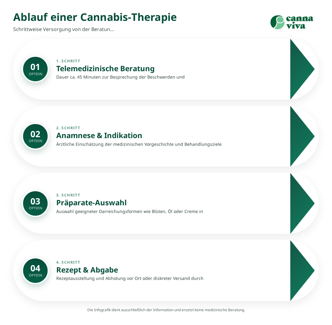 Bei Cannaviva unterstützen wir Sie umfassend bei Ihrer Cannabis-Therapie. Unser Netzwerk aus erfahrenen Ärzten und spezialisierten Apotheken gewährleistet eine optimale Betreuung von der Erstberatung bis zur langfristigen Therapiebegleitung.