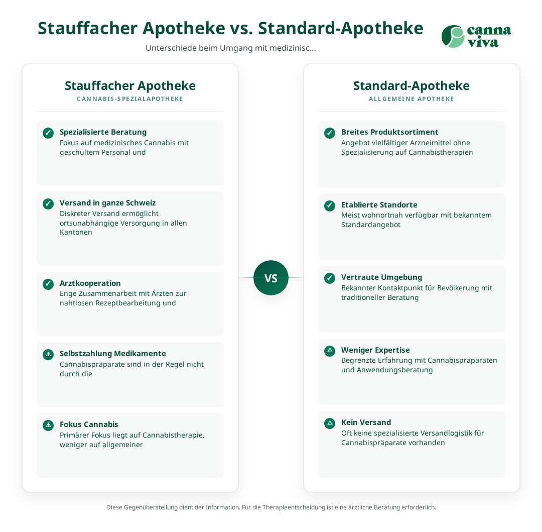 Als Boutique-Apotheke kombiniert die Stauffacher Apotheke traditionelle pharmazeutische Dienstleistungen mit modernen Cannabinoidtherapien. Die Apotheke arbeitet eng mit spezialisierten Ärzten zusammen, um eine nahtlose Versorgung von der Verschreibung bis zur Abgabe sicherzustellen. Dabei steht die Patientensicherheit stets im Vordergrund.
